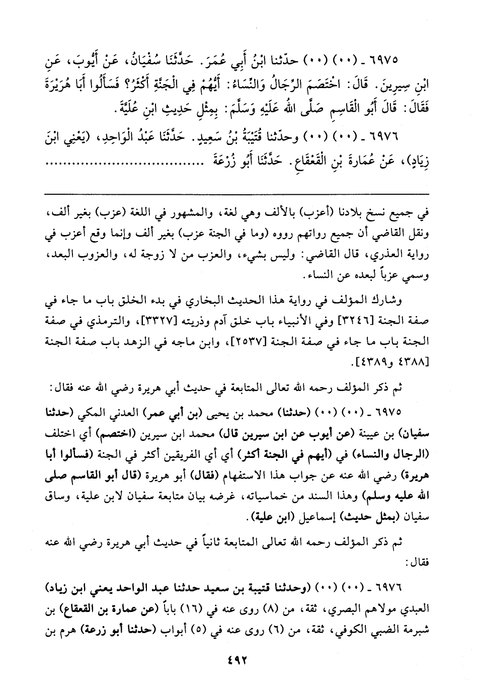 ٦٩٧٥ - (٠٠) (٠٠) (حدّثنا) محمَّد بن يَحْيَى (بن أبي عمر) العدني المكيِّ (حدّثنا سفيان) بن عيينة (عن أيوب عن ابن سيرين قال) محمَّد ابن سيرين (اختصم) أي اختلف (الرجال والنساء) في (أيهم في الجنَّة أكثر) أي أي الفريقين أكثر في الجنَّة (فسألوا أبا هريرة) رضي الله عنه عن جواب هذا الاستفهام (فقال) أبو هريرة (قال أبو القاسم صَلَّى الله عليه وسلم) وهذا السند من خماسياته، غرضه بيان متابعة سفيان لابن علية، وساق سفيان (بمثل حديث) إسماعيل (ابن علية).
