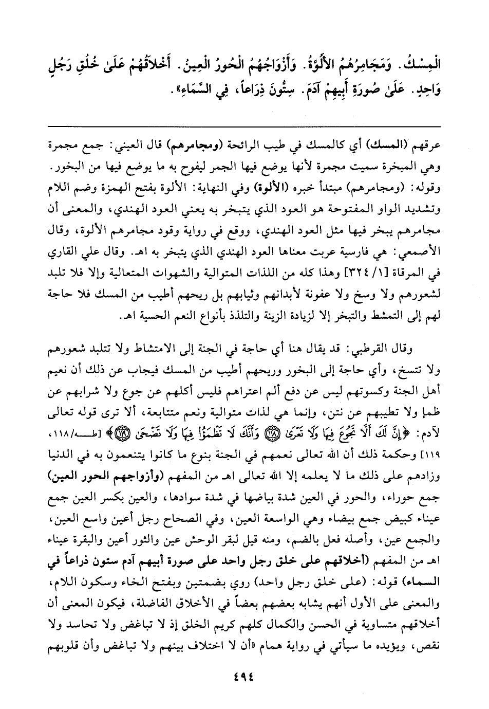 وقال القرطبي: قد يقال هنا أي حاجة في الجنَّة إلى الامتشاط ولا تتلبد شعورهم ولا تتسخ، وأي حاجة إلى البخور وريحهم أطيب من المسك فيجاب عن ذلك أن نعيم أهل الجنَّة وكسوتهم ليس عن دفع ألم اعتراهم فليس أكلهم عن جوع ولا شرابهم عن ظمإ ولا تطيبهم عن نتن، وإنَّما هي لذات متوالية ونعم متتابعة، ألا ترى قوله تعالى لآدم: {إِنَّ لَكَ أَلَّا تَجُوعَ فِيهَا وَلَا تَعْرَى (١١٨) وَأَنَّكَ لَا تَظْمَأُ فِيهَا وَلَا تَضْحَى (١١٩)} [طه: ١١٨، ١١٩] وحكمة ذلك أن الله تعالى نعمهم في الجنَّة بنوع ما كانوا يتنعمون به في الدُّنيا وزادهم على ذلك ما لا يعلمه إلَّا الله تعالى اه من المفهم (وأزواجهم الحور العين) جمع حوراء، والحور في العين شدة بياضها في شدة سوادها، والعين بكسر العين جمع عيناء كبيض جمع بيضاء وهي الواسعة العين، وفي الصحاح رجل أعين واسع العين، والجمع عين، وأصله فعل بالضم، ومنه قيل لبقر الوحش عين والثور أعين والبقرة عيناء اه من المفهم (أخلاقهم على خلق رجل واحد على صورة أبيهم آدم ستون ذراعًا في السماء) قوله: (على خلق رجل واحد) روي بضمتين وبفتح الخاء وسكون اللام، والمعنى على الأوَّل أنهم يشابه بعضهم بعضًا في الأخلاق الفاضلة، فيكون المعنى أن أخلاقهم متساوية في الحسن والكمال كلهم كريم الخلق إذ لا تباغض ولا تحاسد ولا نقص، ويؤيده ما سيأتي في رواية همام "أن لا اختلاف بينهم ولا تباغض وأن قلوبهم