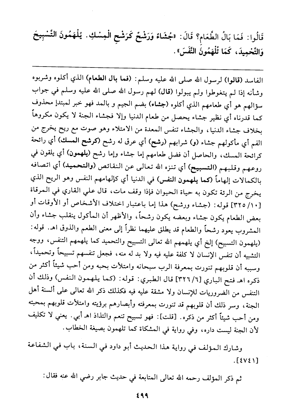 الفاسد (قالوا) لرسول الله صَلَّى الله عليه وسلم: (فما بال الطَّعام) الذي أكلوه وشربوه وشأنه إذا لم يتغوطوا ولم يبولوا (قال) لهم رسول الله صَلَّى الله عليه وسلم في جواب سؤالهم هو أي طعامهم الذي أكلوه (جشاء) بضم الجيم وبالمد فهو خبر لمبتدإ محذوف كما قدرناه أي نظير جشاء يحصل من طعام الدُّنيا وإلا فجشاء الجنَّة لا يكون مكروهًا بخلاف جشاء الدُّنيا، والجشاء تنفس المعدة من الامتلاء وهو صوت مع ريح يخرج من الفم أي مأكولهم جشاء (و) شرابهم (رشح) أي عرق له رشح (كرشح المسك) أي رائحة كرائحة المسك، والحاصل أن فضل طعامهم إمَّا جشاء وإما رشح (يلهمون) أي يلقون في روعهم وقلبهم (التسبيح) أي تنزه الله تعالى عن النقائص (والتحميد) أي اتصافه بالكمالات إلهامًا (كما يلهمون النَّفس) في الدُّنيا أي كإلهامهم النَّفس وهو الرِّيح الذي يخرج من الرئة تكون به حياة الحيوان فإذا وقف مات، قال علي القارئ في المرقاة [١٠/ ٣٢٥] قوله: (جشاء ورشح) هذا إمَّا باعتبار اختلاف الأشخاص أو الأوقات أو بعض الطَّعام يكون جشاء وبعضه يكون رشحًا، والأظهر أن المأكول ينقلب جشاء وأن المشروب يعود رشحًا والطعام قد يطلق عليهما نظرًا إلى معنى الطعم والذوق اه. قوله: (يلهمون التسبيح) إلخ أي يلهمهم الله تعالى التسبيح والتحميد كما يلهمهم التنفس، ووجه التشبيه أن تنفس الإنسان لا كلفة عليه فيه ولابد له منه، فجعل تنفسهم تسبيحًا وتحميدًا، وسببه أن قلوبهم تنورت بمعرفة الرب سبحانه وامتلأت بحبه ومن أحب شيئًا أكثر من ذكره أن فتح الباري [٦/ ٣٢٦] قال الطبري: قوله: (كما يلهمون النَّفس) وذلك أن التنفس من الضروريات للإنسان ولا مشقة عليه فيه فكذلك ذكر الله تعالى على ألسنة أهل الجنَّة، وسر ذلك أن قلوبهم قد تنورت بمعرفته وأبصارهم برؤيته وامتلأت قلوبهم بمحبته ومن أحب شيئًا أكثر من ذكره. [قلت]: فهو تسبيح تنعم والتذاذ اه أبي. يعني لا تكليف لأنَّ الجنَّة ليست داره، وفي رواية في المشكاة كما تلهمون بصيغة الخطاب.