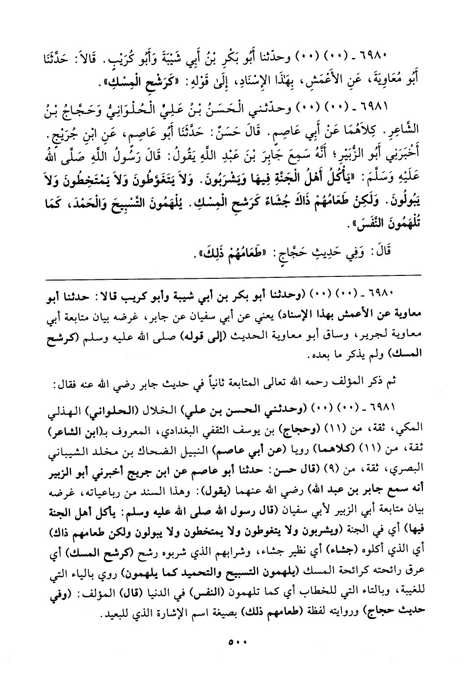 ٦٩٨١ - (٠٠) (٠٠) (وحدثني الحسن بن علي) الخلال (الحلواني) الهذلي المكيِّ، ثقة، من (١١) (وحجاج) بن يوسف الثَّقفيُّ البغدادي، المعروف بـ (ابن الشَّاعر) ثقة، من (١١) (كلاهما) رويا (عن أبي عاصم) النبيل الضَّحَّاك بن مخلد الشيباني البصري، ثقة، من (٩) (قال حسن: حدّثنا أبو عاصم عن ابن جريج أخبرني أبو الزُّبير أنَّه سمع جابر بن عبد الله) رضي الله عنهما (يقول): وهذا السند من رباعياته، غرضه بيان متابعة أبي الزُّبير لأبي سفيان (قال رسول الله صَلَّى الله عليه وسلم: يأكل أهل الجنَّة فيها) أي في الجنَّة (ويشربون ولا يتغوطون ولا يمتخطون ولا يبولون ولكن طعامهم ذاك) أي الذي أكلوه (جشاء) أي نظير جشاء، وشرابهم الذي شربوه رشح (كرشح المسك) أي عرق رائحته كرائحة المسك (يلهمون التسبيح والتحميد كما يلهمون) روي بالياء التي للغيبة، وبالتاء التي للخطاب أي كما تلهمون (النَّفس) في الدُّنيا (قال) المؤلف: (وفي حديث حجاج) وروايته لفظة (طعامهم ذلك) بصيغة اسم الإشارة الذي للبعيد.