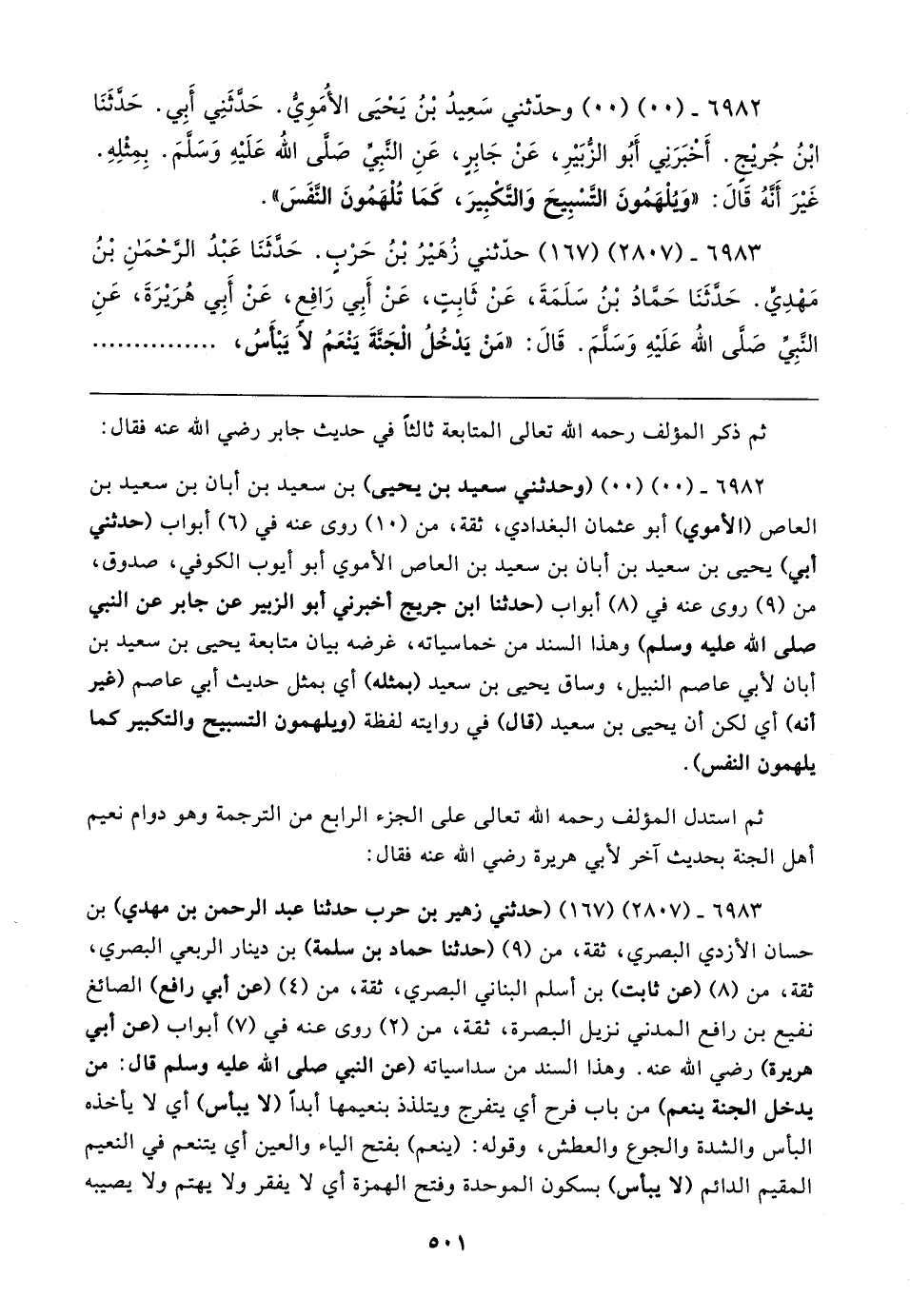 ٦٩٨٢ - (٠٠) (٠٠) (وحدثني سعيد بن يَحْيَى) بن سعيد بن أبان بن سعيد بن العاص (الأموي) أبو عثمان البغدادي، ثقة، من (١٠) روى عنه في (٦) أبواب (حدثني أبي) يَحْيَى بن سعيد بن أبان بن سعيد بن العاص الأموي أبو أيوب الكوفيِّ، صدوق، من (٩) روى عنه في (٨) أبواب (حدّثنا ابن جريج أخبرني أبو الزُّبير عن جابر عن النَّبيّ صلي الله عليه وسلم) وهذا السند من خماسياته، غرضه بيان متابعة يَحْيَى بن سعيد بن أبان لأبي عاصم النبيل، وساق يَحْيَى بن سعيد (بمثله) أي بمثل حديث أبي عاصم (غير أنَّه) أي لكن أن يَحْيَى بن سعيد (قال) في روايته لفظة (ويلهمون التسبيح والتكبير كما يلهمون النَّفس).