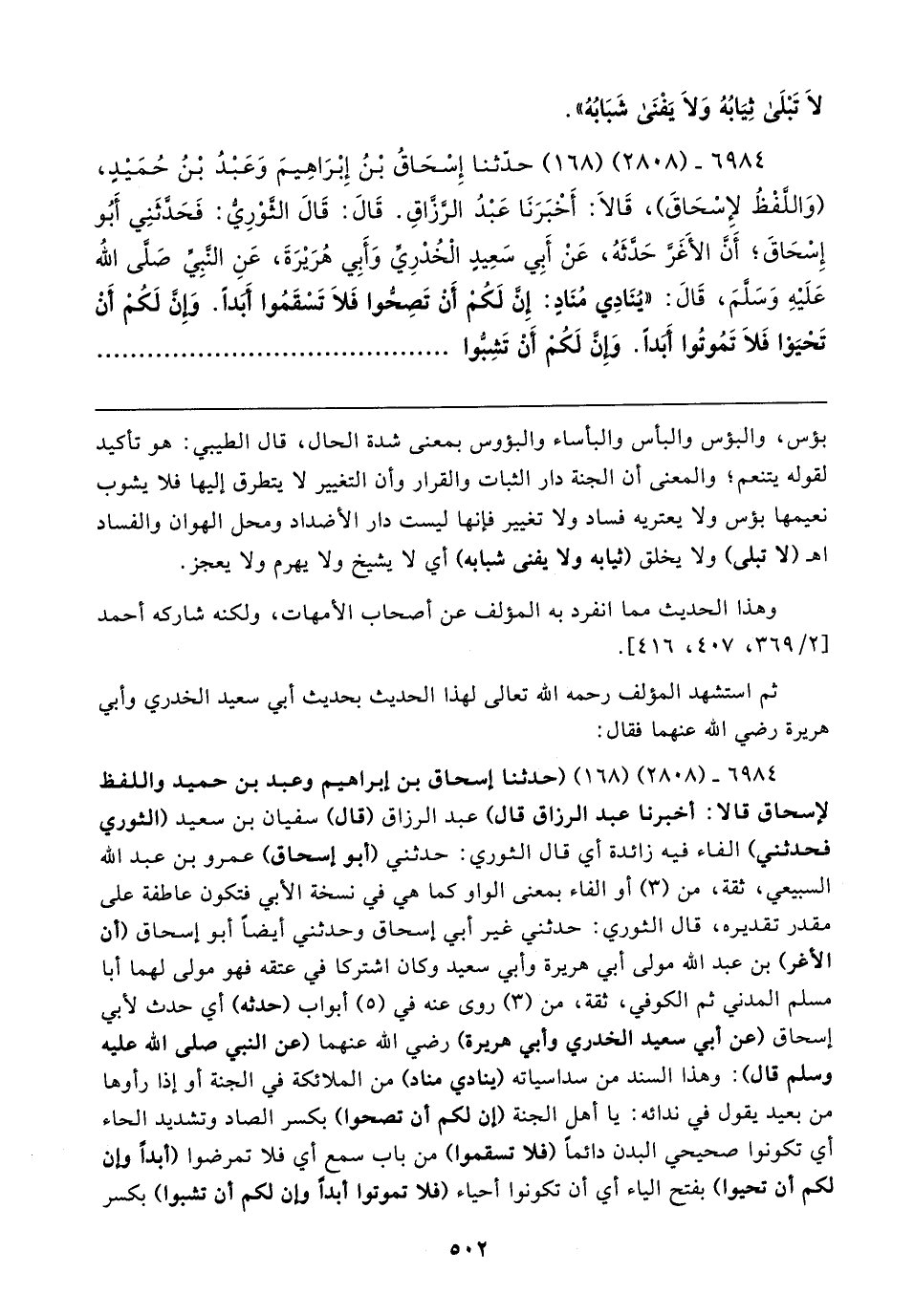 ٦٩٨٤ - (٢٨٠٨) (١٦٨) (حدّثنا إسحاق بن إبراهيم وعبد بن حميد واللفظ وإسحاق قالا: أخبرنا عبد الرَّزاق قال) عبد الرَّزاق (قال) سفيان بن سعيد (الثوري فحدثني) الفاء فيه زائدة أي قال الثوري: حدثني (أبو إسحاق) عمرو بن عبد الله السبيعي، ثقة، من (٣) أو الفاء بمعنى الواو كما هي في نسخة الأبي فتكون عاطفة على مقدر تقديره، قال الثوري: حدثني غير أبي إسحاق وحدثني أيضًا أبو إسحاق (أن الأغر) بن عبد الله مولى أبي هريرة وأبي سعيد وكان اشتركا في عتقه فهو مولى لهما أبا مسلم المدني ثم الكوفيِّ، ثقة، من (٣) روى عنه في (٥) أبواب (حديثه) أي حدث لأبي إسحاق (عن أبي سعيد الخدري وأبي هريرة) رضي الله عنهما (عن النَّبيّ صَلَّى الله عليه وسلم قال): وهذا السند من سداسياته (ينادي مناد) من الملائكة في الجنَّة أو إذا رأوها من بعيد يقول في ندائه: يا أهل الجنَّة (إن لكم أن تصحوا) بكسر الصاد وتشديد الحاء أي تكونوا صحيحي البدن دائمًا (فلا تسقموا) من باب سمع أي فلا تمرضوا (أبدًا وإن لكم أن تحيوا) بفتح الياء أي أن تكونوا أحياء (فلا تموتوا أبدًا وإن لكم أن تشبوا) بكسر