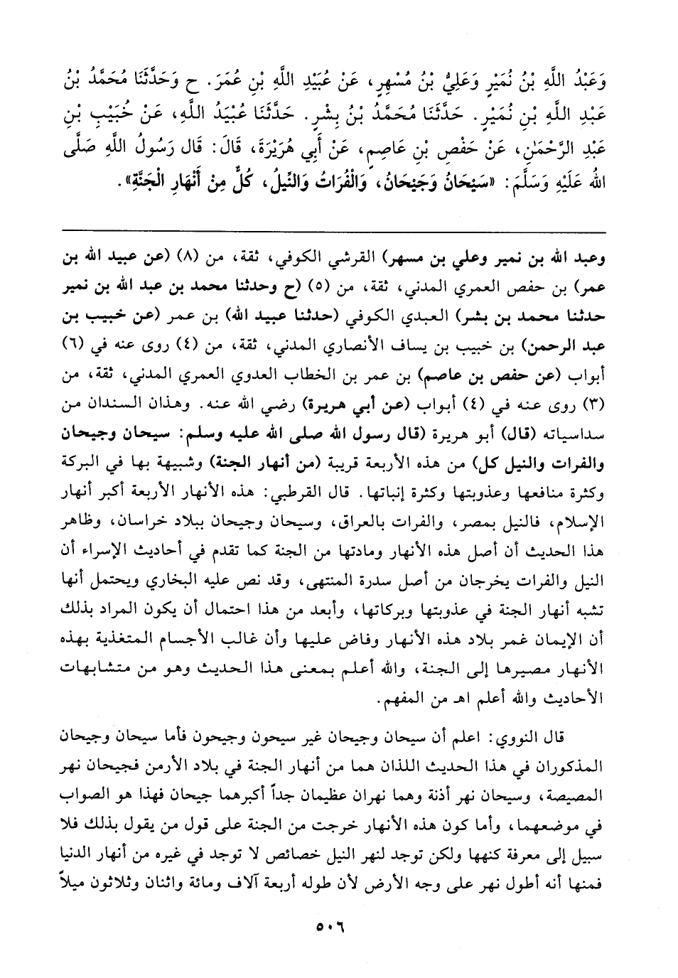 وَعَبْدُ اللهِ بْنُ نُمَيْرٍ وَعَلِيُّ بْنُ مُسْهِرٍ، عَنْ عُبَيْدِ اللهِ بْنِ عُمَرَ. ح وَحَدَّثَنَا مُحَمَّدُ بْنُ عَبْدِ الله بْنِ نُمَيْرٍ. حَدَّثَنَا مُحَمَّدُ بْنُ بِشْرٍ. حَدَّثَنَا عُبْيَدُ اللهِ، عَنْ خُبَيْبِ بْنِ عَبْدِ الرَّحْمَنِ، عَنْ حَفْصِ بْنِ عَاصِمٍ، عَنْ أَبِي هُرَيْرَةَ، قَالَ: قَال: رَسُولُ الله صَلَّى الله عَلَيْهِ وَسَلَّمَ: "سَيحَانُ وَجَيحَانُ، وَالْفُرَاتُ وَالنِّيلُ، كُلٌّ مِنْ أَنْهَارِ الْجَنَّةِ"