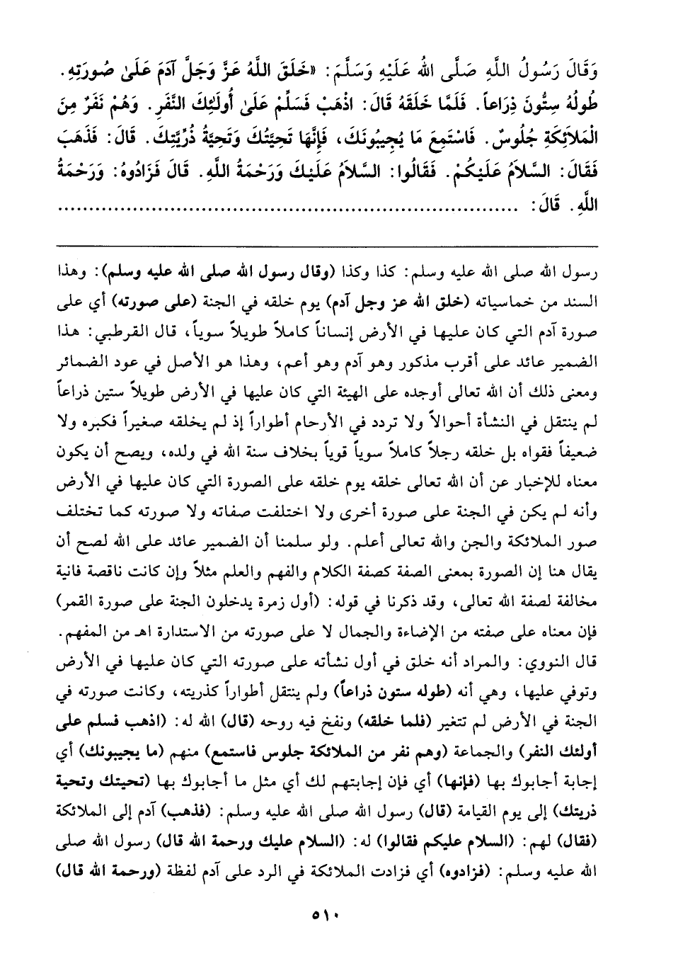 وَقَال رَسُولُ الله صَلَّى الله عَلَيهِ وَسَلَّمَ: "خَلَقَ الله عَزَّ وَجلَّ آدَمَ عَلَى صُورَتِهِ. طُولُهُ سِتُّونَ ذِرَاعًا. فَلَمَّا خَلَقَهُ قَال: اذْهَبْ فَسَلِّمْ عَلَى أُولَئِكَ النَّفَرِ. وَهُمْ نَفَرٌ مِنَ الْمَلائكَةِ جُلُوسٌ. فَاسْتَمِعَ مَا يُجِيبُونَكَ، فَإِنَّهَا تَحِيَّتُكَ وَتَحِيَّةُ ذُرِّيَّتِكَ. قَال: فَذَهَبَ فَقَال: السَّلامُ عَلَيكُمْ. فَقَالوا: السَّلامُ عَلَيكَ وَرَحْمَةُ الله. قَال فَزَادُوهُ: وَرَحْمَةُ اللهِ. قَال: