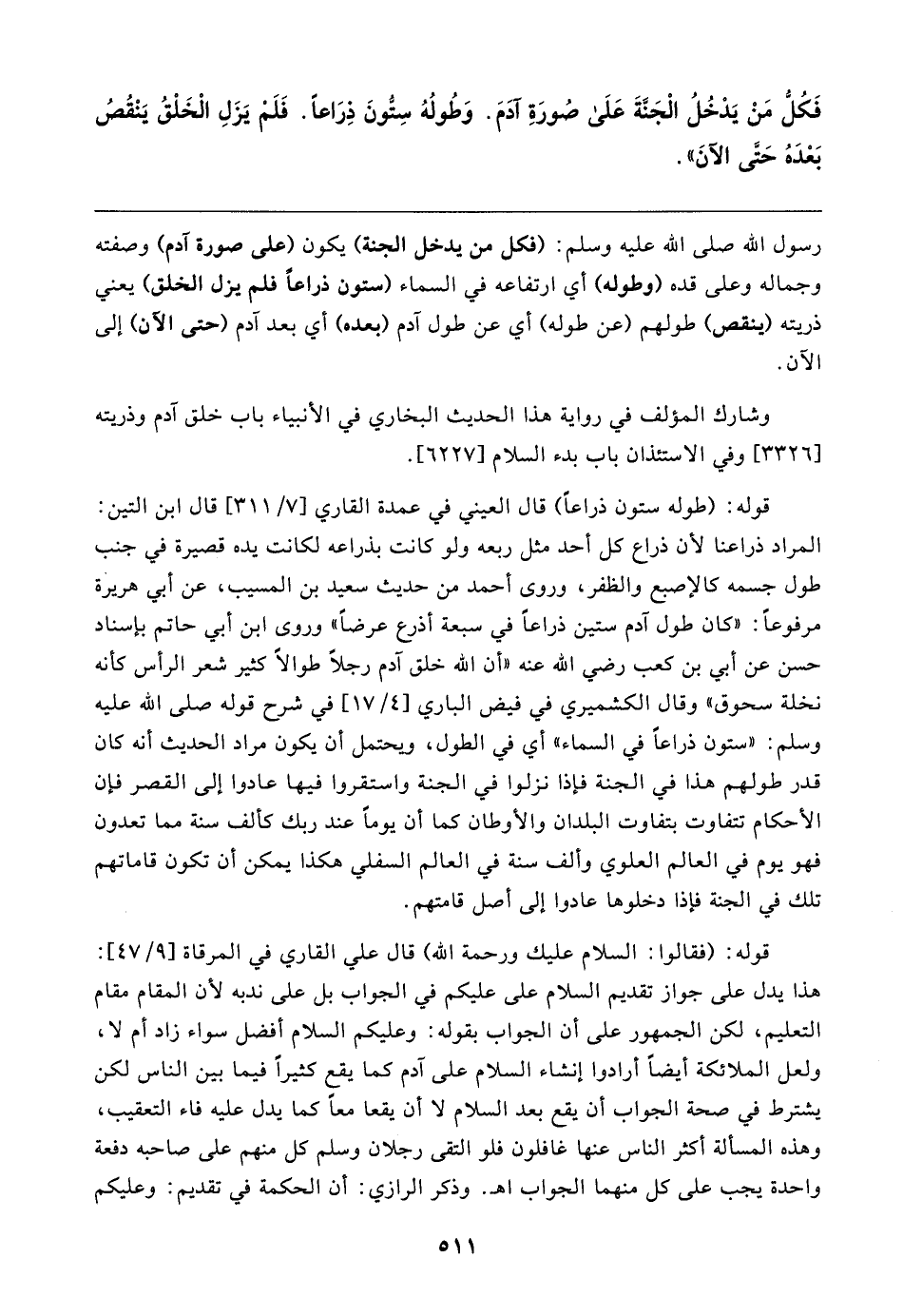رسول الله صَلَّى الله عليه وسلم: (فكل من يدخل الجنَّة) يكون (على صورة آدم) وصفته وجماله وعلى قده (وطوله) أي ارتفاعه في السماء (ستون ذراعًا فلم يزل الخلق) يعني ذريته (ينقص) طولهم (عن طوله) أي عن طول آدم (بعده) أي بعد آدم (حتَّى الآن) إلى الآن.