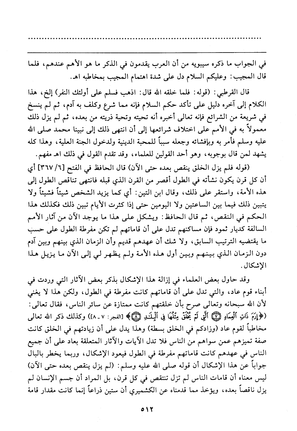 وقد حاول بعض العلماء في إزالة هذا الإشكال بذكر بعض الآثار التي وردت في أبناء قوم عاد، والتي تدل على أن قاماتهم كانت مفرطة في الطول، ولكن هذا لا يغني لأنَّ الله سبحانه وتعالى صرح بأن خلقتهم كانت ممتازة عن سائر النَّاس، فقال تعالى: ({إِرَمَ ذَاتِ الْعِمَادِ (٧) الَّتِي لَمْ يُخْلَقْ مِثْلُهَا فِي الْبِلَادِ (٨)} [الفجر: ٧ - ٨]) وكذلك ذكر الله تعالى مخاطبًا لقوم عاد (وزادكم في الخلق بسطة) وهذا يدل على أن زيادتهم في الخلق كانت صفة تميزهم عمن سواهم من النَّاس فلا تدل الآيات والآثار المتعلقة بعاد على أن جميع النَّاس في عهدهم كانت قاماتهم مفرطة في الطول فيعود الإشكال، وربما يخطر بالبال جوابًا عن هذا الإشكال أن قوله صَلَّى الله عليه وسلم: (لم يزل ينقص بعده حتَّى الآن) ليس معناه أن قامات النَّاس لم تزل تنتقص في كل قرن، بل المراد أن جسم الإنسان لم يزل ناقصًا بعده، ويؤخذ مما قدمناه عن الكشميري أن ستِّين ذراعًا إنَّما كانت مقدار قامة