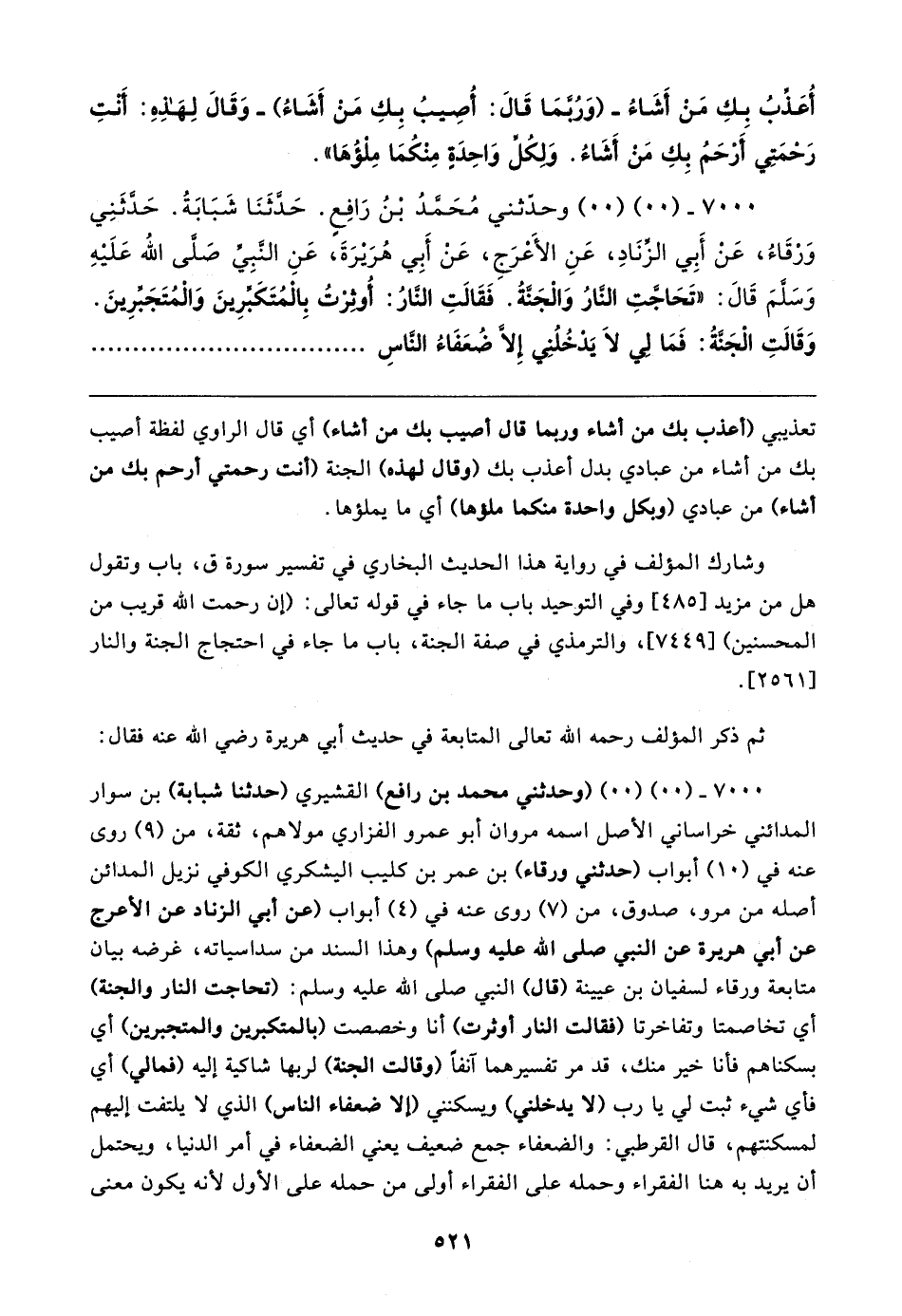 ٧٠٠٠ - (٠٠) (٠٠) وحدّثني مُحَمَّدُ بْنُ رَافِعٍ. حَدَّثَنَا شَبَابَةُ. حَدَّثَنِي وَرْقَاءُ، عَنْ أَبِي الزِّنَادِ، عَنِ الأَعْرَجِ، عَنْ أَبِي هُرَيرَةَ، عَنِ النَّبِيِّ صَلَّى الله عَلَيهِ وَسَلَّمَ قَال: "تَحَاجَّتِ النَّارُ وَالْجَنَّةُ. فَقَالتِ النَّارُ: أُوثرْتُ بِالْمُتَكَبِّرِينَ وَالْمُتَجَبِّرِينَ. وَقَالتِ الْجَنَّةُ: فَمَا لي لا يَدخُلُني إلا ضُعَفَاءُ النَّاسِ