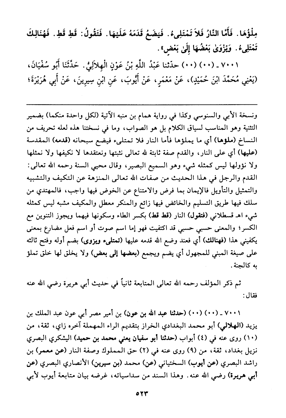 ٧٠٠١ - (٠٠) (٠٠) (حدَّثنا عبد الله بن عون) بن أمير مصر أبي عون عبد الملك بن يزيد (الهلالي) أبو محمَّد البغدادي الخراز بتقديم الراء المهملة آخره زاي، ثقة، من (١٠) روى عنه في (٤) أبواب (حدَّثنا أبو سفيان يعني محمَّد بن حميد) اليشكري البصري نزيل بغداد، ثقة، من (٩) روى عنه في (٢) حق المملوك وصفة النَّار (عن معمر) بن راشد البصري (عن أيوب) السختياني (عن) محمَّد (بن سيرين) الأنصاري البصري (عن أبي هريرة) رضي الله عنه. وهذا السند من سداسياته، غرضه بيان متابعة أيوب لأبي