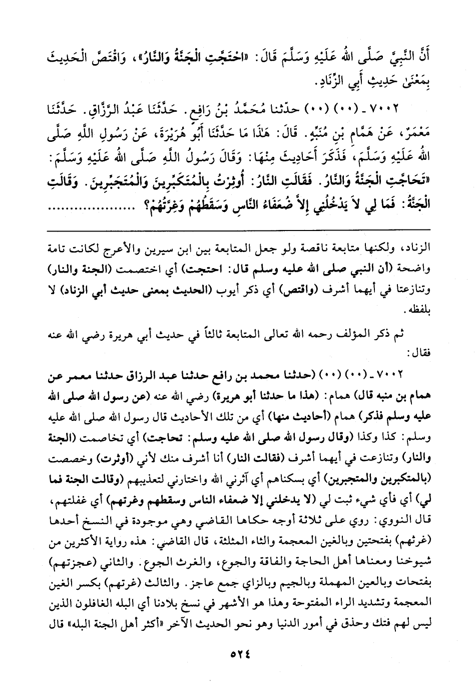 ٧٠٠٢ - (٠٠) (٠٠) حدَّثنا مُحَمَّدُ بْنُ رَافِعٍ. حَدَّثَنَا عَبْدُ الرَّزاقِ. حَدَّثَنَا مَعْمَرٌ، عَنْ هَمَّامِ بنِ مُنَبِّهٍ. قَال: هَذَا مَا حَدَّثَنَا أَبُو هُرَيرَةَ، عَنْ رَسُولِ الله صَلَّى الله عَلَيهِ وَسَلَّمَ، فَذَكَرَ أَحَادِيثَ مِنْهَا: وَقَال رَسُولُ اللهِ صَلَّى الله عَلَيهِ وَسَلَّمَ: "تَحَاجَّتِ الْجَنَّةُ وَالنَّارُ. فَقَالتِ النَّارُ: أُوثِرْتُ بِالْمُتَكَبِّرِينَ وَالمُتَجَبِّرِينَ. وَقَالتِ الْجَنَّةُ: فَمَا لي لَا يَدخُلُني إلا ضُعَفَاءُ النَّاسِ وَسَقَطُهُمْ وَغرَّتُهُمْ؟