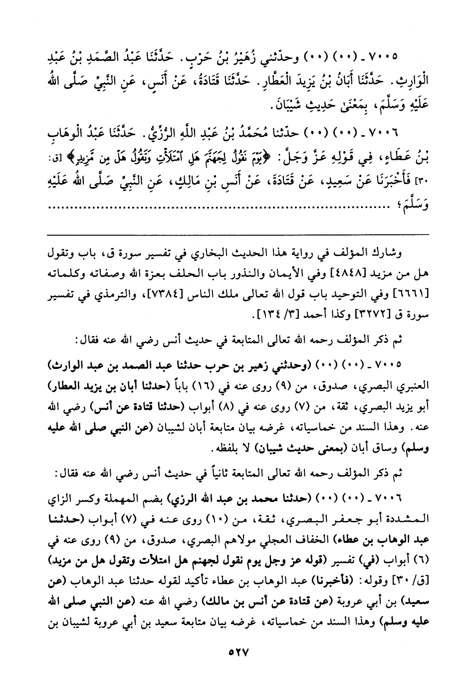 ٧٠٠٥ - (٠٠) (٠٠) (وحدثني زهير بن حرب حدَّثنا عبد الصَّمد بن عبد الوارث) العنبري البصري، صدوق، من (٩) روى عنه في (١٦) بابا (حدَّثنا أبان بن يزيد العطار) أبو يزيد البصري، ثقة، من (٧) روى عنه في (٨) أبواب (حدَّثنا قتادة عن أنس) رضي الله عنه. وهذا السند من خماسياته، غرضه بيان متابعة أبان لشيبان (عن النَّبيِّ صَلَّى الله عليه وسلم) وساق أبان (بمعنى حديث شيبان) لا بلفظه.