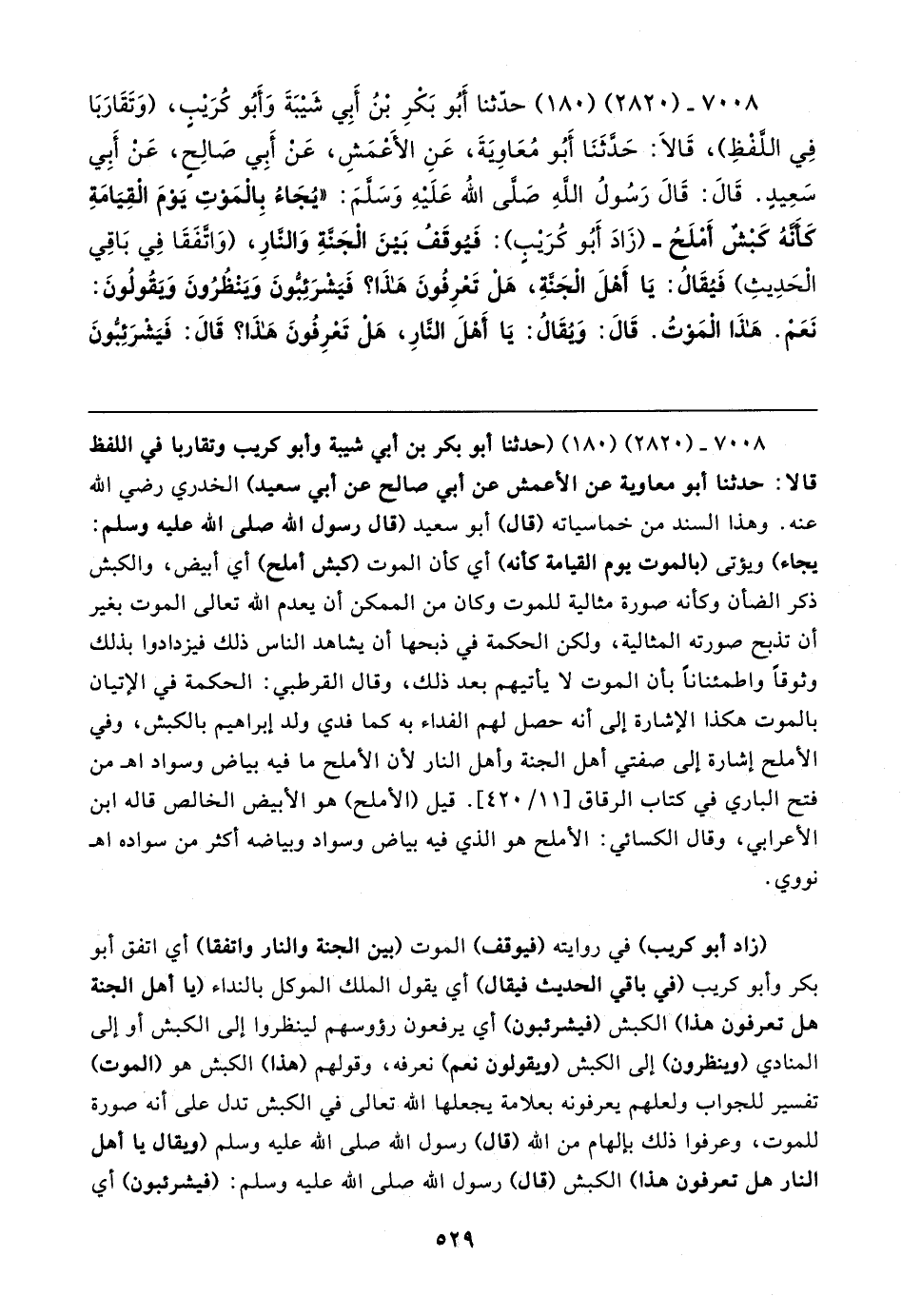 ٧٠٠٨ - (٢٨٢٠) (١٨٠) حدَّثنا أَبُو بَكرِ بْنُ أَبِي شَيبَةَ وَأَبُو كُرَيبٍ، (وَتَقَارَبَا فِي اللَّفْظِ)، قَالا: حَدَّثَنَا أَبُو مُعَاويةَ، عَنِ الأَعمَشِ، عَنْ أَبِي صَالِح، عَنْ أَبِي سَعِيدٍ. قَال: قَال رَسُولُ الله صَلَّى الله عَلَيهِ وَسَلَّمَ: "يُجَاءُ بِالمَوتِ يَومَ القِيَامَةِ كَأنَّهُ كَبْش أَمْلَحُ - (زَادَ أَبُو كُرَيبٍ): فَيُوقَفُ بَينَ الْجَنَّةِ وَالنَّارِ، (وَاتَّفَقَا فِي بَاقِي الْحَدِيثِ) فَيُقَالُ: يَا أَهلَ الْجَنَّةِ، هَلْ تَعْرِفُونَ هَذَا؟ فَيَشْرَئِبُّونَ وَيَنظُرُونَ ويقُولُونَ: نَعَمْ. هَذَا المَوْتُ. قَال: وَيُقَالُ: يَا أَهْلَ النَّارِ، هَل تَعْرِفُونَ هَذَا؟ قَال: فَيَشْرَئِبُّونَ