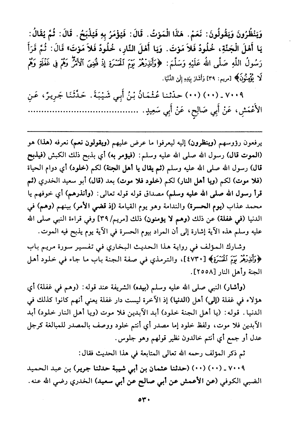 وَيَنْظُرُونَ ويقُولُونَ: نَعَم. هَذَا المَوْتُ. قال: فَيُؤْمَرُ بِهِ فَيُذبَحُ. قَال: ثُمَّ يُقَالُ: يَا أَهلَ الْجَنَّةِ، خُلُودٌ فَلَا مَوتَ. ويا أَهْلَ النَّارِ، خُلُودٌ فَلَا مَوتَ" قَال: ثُمَّ قَرَأَ رَسُولُ اللهِ صَلَّى الله عَلَيهِ وَسَلَّمَ: {وَأَنْذِرْهُمْ يَوْمَ الْحَسْرَةِ إِذْ قُضِيَ الْأَمْرُ وَهُمْ فِي غَفْلَةٍ وَهُمْ لَا يُؤْمِنُونَ} [مريم: ٣٩] وَأَشَارَ بِيَدِهِ إِلى الدُّنيَا.