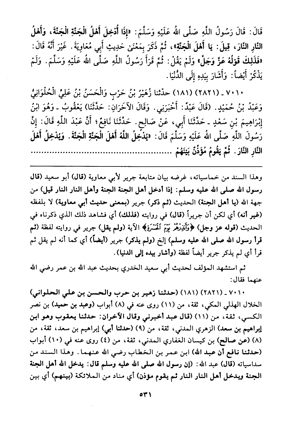 ٧٠١٠ - (٢٨٢١) (١٨١) (حدَّثنا زهير بن حرب والحسن بن علي الحلواني) الخلال الهذلي المكي، ثقة، من (١١) روى عنه في (٨) أبواب (وعبد بن حميد) بن نصر الكسي، ثقة، من (١١) (قال عبد أخبرني وقال الآخران: حدَّثنا يعقوب وهو ابن إبراهيم بن سعد) الزُّهريّ المدني، ثقة، من (٩) (حدَّثنا أبي) إبراهيم بن سعد، ثقة، من (٨) (عن صالح) بن كيسان الغفاري المدني، ثقة، من (٤) روى عنه في (١٠) أبواب (حدَّثنا نافع أن عبد الله) ابن عمر بن الخطاب رضي الله عنهما. وهذا السند من سداسياته (قال) عبد الله: (إن رسول الله صَلَّى الله عليه وسلم قال: يدخل الله أهل الجنَّة الجنَّة ويدخل أهل النَّار النَّار ثم يقوم مؤذن) أي مناد من الملائكة (بينهم) أي بين