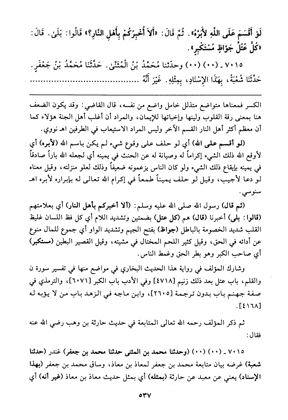 ٧٠١٥ - (٠٠) (٠٠) (وحدثنا محمَّد بن المثنى حدَّثنا محمَّد بن جعفر) غندر (حدَّثنا شعبة) غرضه بيان متابعة محمَّد بن جعفر لمعاذ بن معاذ، وساق محمَّد بن جعفر (بهذا الإسناد) يعني عن معبد عن حارثة (بمثله) أي بمثل حديث معاذ بن معاذ (غير أنه) أي