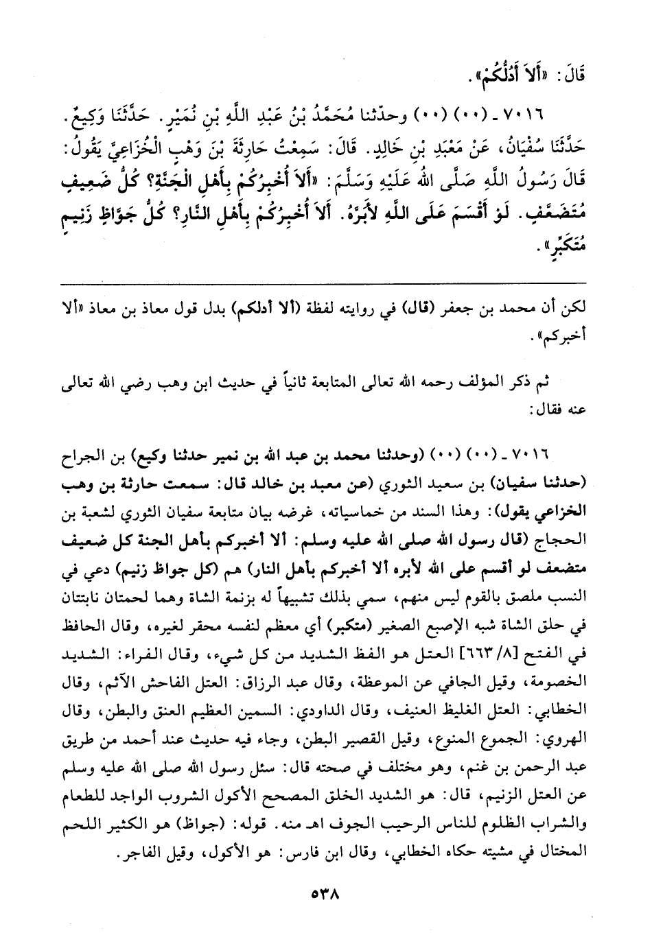 ٧٠١٦ - (٠٠) (٠٠) وحدّثنا مُحَمَّدُ بْنُ عَبدِ الله بْنِ نُمَيرٍ. حَدَّثَنَا وَكِيعٌ. حَدَّثَنَا سُفْيَانُ، عَنْ مَعْبَدِ بْنِ خَالِدٍ. قَال: سَمِعْتُ حَارِثَةَ بْنَ وَهْبِ الْخُزَاعيِّ يَقُولُ: قَال رَسُولُ الله صَلَّى الله عَلَيهِ وَسَلَّمَ: "أَلا أُخْبِرُكُمْ بِأهْلِ الْجَنَّةِ؟ كُل ضَعِيفٍ مُتَضَعَّفٍ. لَوْ أَقْسَمَ عَلَى الله لأبَرَّهُ. أَلا أخْبِرُكُمْ بِأهْلِ النَّارِ؟ كُلُّ جَوَّاظٍ زَنيمٍ مُتَكَبِّرٍ"