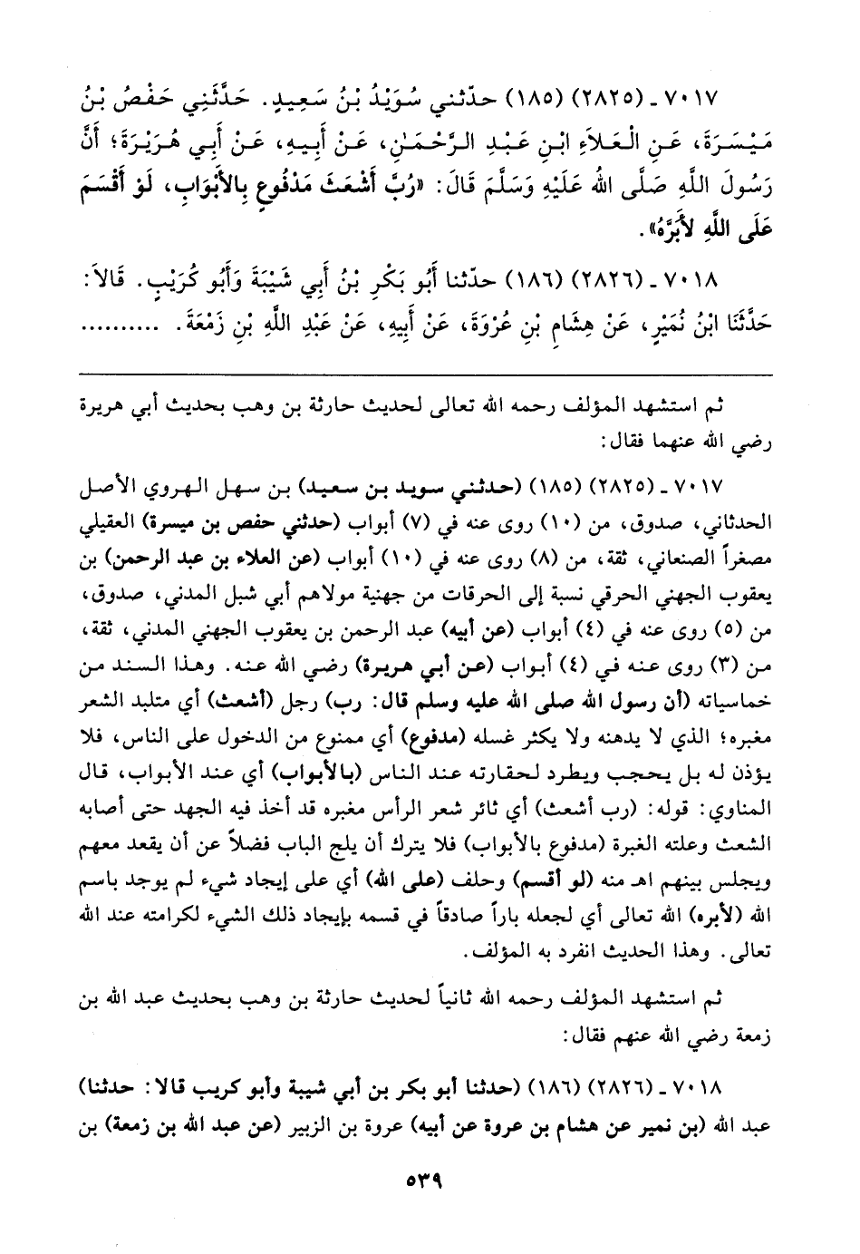 ٧٠١٧ - (٢٨٢٥) (١٨٥) (حدثني سويد بن سعيد) بن سهل الهروي الأصل الحدثاني، صدوق، من (١٠) روى عنه في (٧) أبواب (حدثني حفص بن ميسرة) العقيلي مصغرًا الصنعاني، ثقة، من (٨) روى عنه في (١٠) أبواب (عن العلاء بن عبد الرحمن) بن يعقوب الجهني الحرقي نسبة إلى الحرقات من جهنية مولاهم أبي شبل المدني، صدوق، من (٥) روى عنه في (٤) أبواب (عن أبيه) عبد الرحمن بن يعقوب الجهني المدني، ثقة، من (٣) روى عنه في (٤) أبواب (عن أبي هريرة) رضي الله عنه. وهذا السند من خماسياته (أن رسول الله صَلَّى الله عليه وسلم قال: رب) رجل (أشعث) أي متلبد الشعر مغبره؛ الذي لا يدهنه ولا يكثر غسله (مدفوع) أي ممنوع من الدخول على النَّاس، فلا يؤذن له بل يحجب ويطرد لحقارته عند النَّاس (بالأبواب) أي عند الأبواب، قال المناوي: قوله: (رب أشعث) أي ثائر شعر الرأس مغبره قد أخذ فيه الجهد حتَّى أصابه الشعث وعلته الغبرة (مدفوع بالأبواب) فلا يترك أن يلج الباب فضلًا من أن يقعد معهم ويجلس بينهم اهـ منه (لو أقسم) وحلف (على الله) أي على إيجاد شيء لم يوجد باسم الله (لأبره) الله تعالى أي لجعله بارًّا صادقًا في قسمه بإيجاد ذلك الشيء لكرامته عند الله تعالى. وهذا الحديث انفرد به المؤلف.