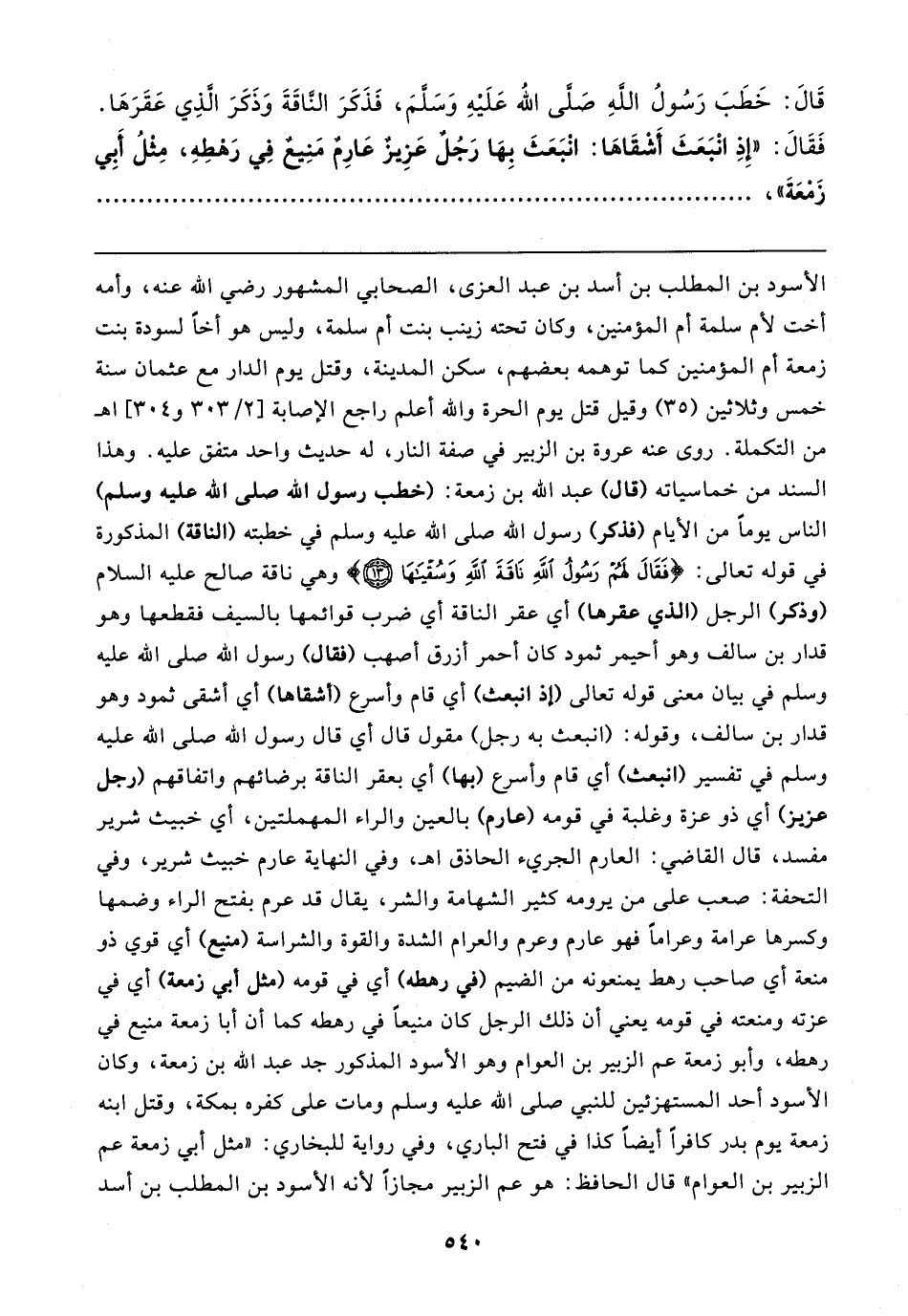الأسود بن المطلب بن أسد بن عبد العزى، الصحابي المشهور رضي الله عنه، وأمه أخت لأم سلمة أم المؤمنين، وكان تحته زينب بنت أم سلمة، وليس هو أخًا لسودة بنت زمعة أم المؤمنين كما توهمه بعضهم، سكن المدينة، وقتل يوم الدار مع عثمان سنة خمس وثلاثين (٣٥) وقيل قتل يوم الحرة والله أعلم راجع الإصابة [٢/ ٣٠٣ و ٣٠٤] اهـ من التكملة. روى عنه عروة بن الزُّبير في صفة النَّار، له حديث واحد متَّفقٌ عليه. وهذا السند من خماسياته (قال) عبد الله بن زمعة: (خطب رسول الله صَلَّى الله عليه وسلم) النَّاس يومًا من الأيَّام (فذكر) رسول الله صَلَّى الله عليه وسلم في خطبته (الناقة) المذكورة في قوله تعالى: {فَقَال لَهُمْ رَسُولُ اللهِ نَاقَةَ اللَّهِ وَسُقْيَاهَا (١٣)} وهي ناقة صالح عليه السَّلام (وذكر) الرجل (الذي عقرها) أي عقر الناقة أي ضرب قوائمها بالسيف فقطعها وهو قدار بن سالف وهو أحيمر ثمود كان أحمر أزرق أصهب (فقال) رسول الله صَلَّى الله عليه وسلم في بيان معنى قوله تعالى (إذ انبعث) أي قام وأسرع (أشقاها) أي أشقى ثمود وهو قدار بن سالف، وقوله: (انبعث به رجل) مقول قال أي قال رسول الله صَلَّى الله عليه وسلم في تفسير (انبعث) أي قام وأسرع (بها) أي بعقر الناقة برضائهم واتفاقهم (رجل عزيز) أي ذو عزة وغلبة في قومه (عارم) بالعين والراء المهملتين؛ أي خبيث شرير مفسد، قال القاضي: العارم الجريء الحاذق اهـ، وفي النهاية عارم خبيث شرير، وفي التحفة: صعب على من يرومه كثير الشهامة والشر، يقال قد عرم بفتح الراء وضمها وكسرها عرامة وعرامًا فهو عارم وعرم والعرام الشدة والقوة والشراسة (منيع) أي قوي ذو منعة أي صاحب رهط يمنعونه من الضيم (في رهطه) أي في قومه (مثل أبي زمعة) أي في عزته ومنعته في قومه يعني أن ذلك الرجل كان منيعًا في رهطه كما أن أبا زمعة منيع في رهطه، وأبو زمعة عم الزُّبير بن العوام وهو الأسود المذكور جد عبد الله بن زمعة، وكان الأسود أحد المستهزئين للنبي صَلَّى الله عليه وسلم ومات على كفره بمكة، وقتل ابنه زمعة يوم بدر كافرًا أيضًا كذا في فتح الباري، وفي رواية للبخاري: "مثل أبي زمعة عم الزُّبير بن العوام" قال الحافظ: هو عم الزُّبير مجازًا لأنه الأسود بن المطلب بن أسد