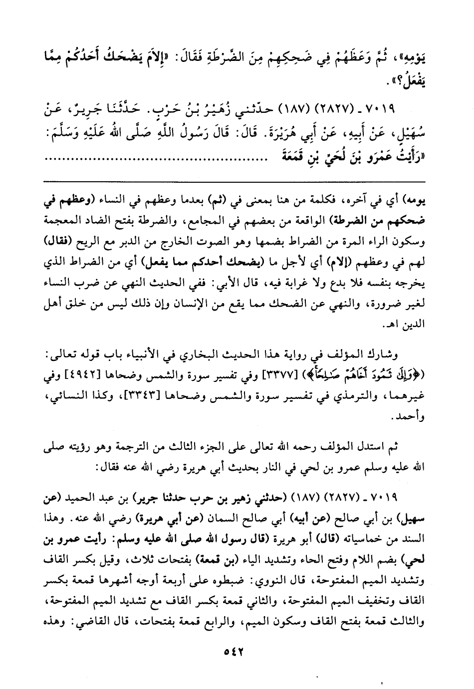 ٧٠١٩ - (٢٨٢٧) (١٨٧) (حدثني زهير بن حرب حدَّثنا جرير) بن عبد الحميد (عن سهيل) بن أبي صالح (عن أبيه) أبي صالح السمان (عن أبي هريرة) رضي الله عنه. وهذا السند من خماسياته (قال) أبو هريرة (قال رسول الله صلى الله عليه وسلم: رأيت عمرو بن لحي) بضم اللام وفتح الحاء وتشديد الياء (بن قمعة) بفتحات ثلاث، وقيل بكسر القاف وتشديد الميم المفتوحة، قال النووي: ضبطوه على أربعة أوجه أشهرها قمعة بكسر القاف وتخفيف الميم المفتوحة، والثَّاني قمعة بكسر القاف مع تشديد الميم المفتوحة، والثالث قمعة بفتح القاف وسكون الميم، والرابع قمعة بفتحات، قال القاضي: وهذه