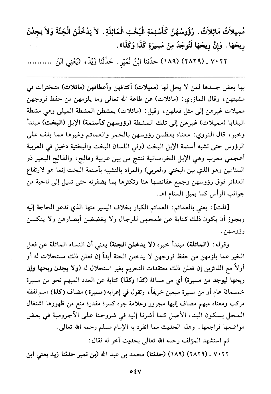 مُمِيلاتٌ مَائِلاتٌ. رُؤُوسُهُنَّ كَأسْنِمَةِ الْبُختِ الْمَائِلَةِ. لَا يَدْخُلْنَ الْجَنَّةَ وَلَا يَجِدْنَ رِيحَهَا. وَإِنَّ رِيحَهَا لَتُوجَدُ مِنْ مَسِيرَةِ كَذَا وَكَذَا".