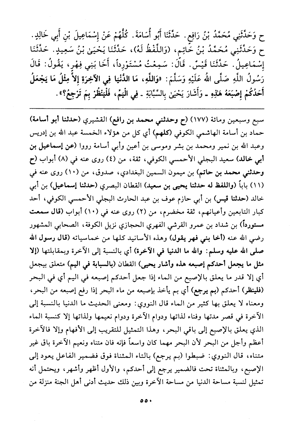 سبع وسبعين ومائة (١٧٧) (ح وحدثني محمَّد بن رافع) القشيري (حدَّثنا أبو أسامة) حماد بن أسامة الهاشمي الكوفي (كلهم) أي كل من هؤلاء الخمسة عبد الله بن إدريس وعبد الله بن نمير ومحمد بن بشر وموسى بن أعين وأبي أسامة رووا (عن إسماعيل بن أبي خالد) سعيد البجلي الأحمسي الكوفيّ، ثقة، من (٤) روى عنه في (٨) أبواب (ح وحدثني محمَّد بن حاتم) بن ميمون السمين البغدادي، صدوق، من (١٠) روى عنه في (١١) بابا (واللفظ له حدَّثنا يَحْيَى بن سعيد) القطان البصري (حدَّثنا إسماعيل) بن أبي خالد (حدَّثنا قيس) بن أبي حازم عوف بن عبد الحارث البجلي الأحمسي الكوفيّ، أحد كبار التّابعين وأعيانهم، ثقة مخضرم، من (٢) روى عنه في (١٠) أبواب (قال سمعت مستوردًا) بن شداد بن عمرو القرشي الفهري الحجازي نزيل الكوفة، الصحابي المشهور رضي الله عنه (أخا بني فهر يقول) وهذه الأسانيد كلُّها من خماسياته (قال رسول الله صَلَّى الله عليه وسلم: والله ما الدُّنيا في الآخرة) أي بالنسبة إلى الآخرة وبمقابلتها (إلَّا مثل ما يجعل أحدكم إصبعه هذه وأشار يَحْيَى) القطان (بالسبابة في اليم) متعلق بيجعل أي إلَّا قدر ما يعلى بالإصبع من الماء إذا جعل أحدكم إصبعه في اليم أي في البحر (فلينظر) أحدكم (بم يرجع) أي بم يأخذ بإصبعه من ماء البحر إذا رفع إصبعه من البحر، ومعناه لا يعلق بها كثير من الماء قال النووي: ومعنى الحديث ما الدُّنيا بالنسبة إلى الآخرة في قصر مدتها وفناء لذاتها ودوام الآخرة ودوام نعيمها ولذاتها إلَّا كنسبة الماء الذي يعلى بالإصبع إلى باقي البحر، وهذا التمثيل للتقريب إلى الأفهام وإلا فالآخرة أعظم وأجل من البحر لأنَّ البحر مهما كان واسعًا فإنَّه فإن متناه ونعيم الآخرة باق غير متناه، قال النووي: ضبطوا (بم يرجع) بالتاء المثناة فوق فضمير الفاعل يعود إلى الإصبع، وبالمثناة تحت فالضمير يرجع إلى أحدكم، والأول أظهر وأشهر، ويحتمل أنَّه تمثيل لنسبة مساحة الدُّنيا من مساحة الآخرة وبين ذلك حديث أدنى أهل الجنَّة منزلة من