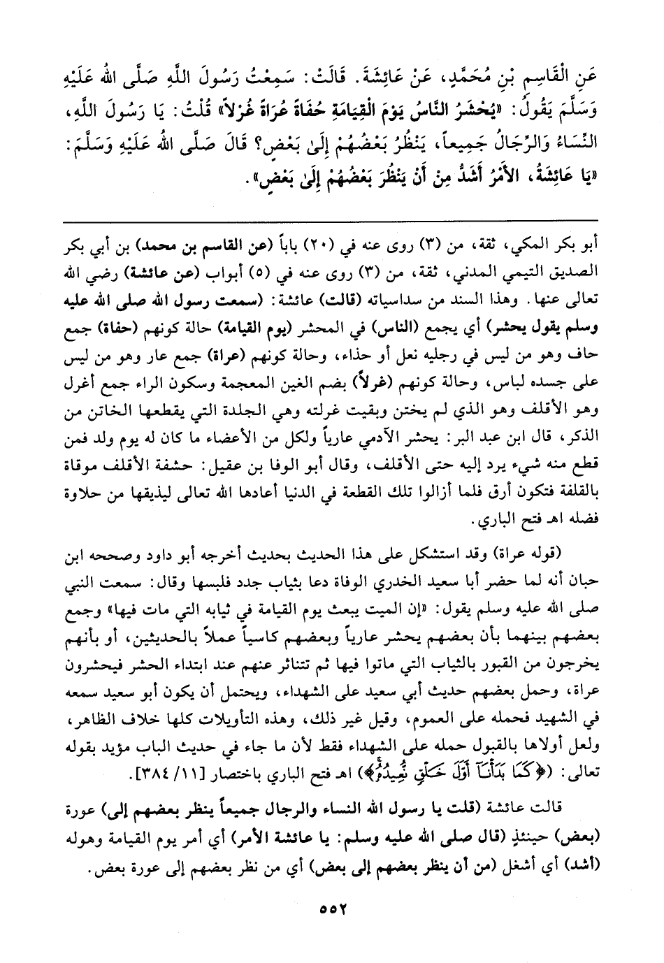 عَنِ الْقَاسِمِ بْنِ مُحَمَّدٍ، عَنْ عَائِشَةَ. قَالتْ: سَمِعْتُ رَسُولَ الله صَلَّى الله عَلَيهِ وَسَلَّمَ يَقُولُ: "يُحْشَرُ النَّاسُ يَوْمَ الْقِيَامَةِ حُفَاةً عُرَاةً غُرْلًا" قُلْتُ: يَا رَسُولَ الله، النِّسَاءُ وَالرِّجَالُ جَمِيعًا، يَنْظُرُ بَعْضُهُمْ إِلَى بعْضٍ؟ قَال صَلَّى الله عَلَيهِ وَسَلَّمَ: "يَا عَائِشَةُ، الأَمْرُ أَشَدُّ مِنْ أَنْ يَنْظُرَ بَعْضُهُمْ إِلَى بعْضٍ"