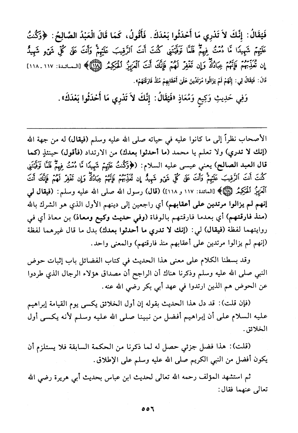 فَيُقَالُ: إِنَّكَ لَا تَدْرِي مَا أَحْدَثُوا بَعْدَكَ. فَأقُولُ، كَمَا قَال الْعَبْدُ الصَّالِحُ: {وَكُنْتُ عَلَيهِمْ شَهِيدًا مَا دُمْتُ فِيهِمْ فَلَمَّا تَوَفَّيتَنِي كُنْتَ أَنْتَ الرَّقِيبَ عَلَيهِمْ وَأَنْتَ عَلَى كُلِّ شَيءٍ شَهِيدٌ (١١٧) إِنْ تُعَذِّبْهُمْ فَإِنَّهُمْ عِبَادُكَ وَإِنْ تَغْفِرْ لَهُمْ فَإِنَّكَ أَنْتَ الْعَزِيزُ الْحَكِيمُ (١١٨)} [المائدة: ١١٧ - ١١٨] قَال: فَيُقَالُ لي: إِنَّهُم لَم يزَالُوا مُرتَدِّينَ عَلَى أَعقَابِهِم مُنذُ فارَقتَهُم".
