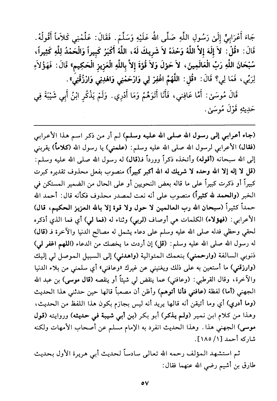 جَاءَ أَعْرَابِيٌّ إِلَى رَسُولِ اللهِ صَلَّى اللَّه عَلَيْهِ وَسَلَّمَ. فَقَالَ: عَلِّمْنِي كَلَامًا أَقُولُهُ. قَالَ: "قُلْ: لَا إِلَهَ إِلَّا اللَّهُ وَحْدَهُ لَا شَرِيكَ لَهُ، اللهُ أَكبَرُ كَبِيرًا وَالْحَمْدُ لِلهِ كَثِيرًا، سُبْحَانَ اللهِ رَبِّ الْعَالَمِينَ، لَا حَوْلَ وَلَا قُوَّةَ إِلَّا بِاللَّهِ الْعَزِيزِ الْحَكِيمِ" قَالَ: فَهَؤُلَاءِ لِرَبِّي، فَمَا لِي؟ قَالَ: "قُلِ: اللَّهُمَّ اغْفِرْ لِي وَارْحَمْنِي وَاهْدِنِي وَارْزُقْنِي".