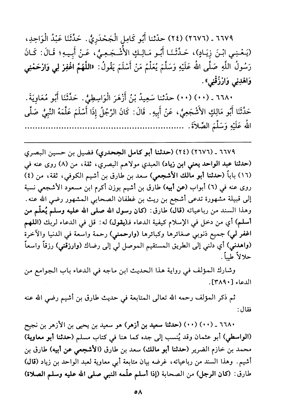 ٦٦٧٩ - (٢٦٧٦) (٢٤) (حدثنا أبو كامل الجحدري) فضيل بن حسين البصري (حدثنا عبد الواحد يعني ابن زياد) العبدي مولاهم البصري، ثقة، من (٨) روى عنه في (١٦) بابًا (حدثنا أبو مالك الأشجعي) سعد بن طارق بن أشيم الكوفي، ثقة، من (٤) روى عنه في (٦) أبواب (عن أبيه) طارق بن أشيم بوزن أكرم ابن مسعود الأشجعي نسبة إلى قبيلة مشهورة تدعى أشجع بن ريث بن غطفان الصحابي المشهور رضي الله عنه. وهذا السند من رباعياته (قال) طارق: أكان رسول الله صلى الله عليه وسلم يُعلّم من أسلم) أي من دخل في الإسلام كيفية الدعاء فـ (يقول) له: قل في الدعاء لربك (اللهم اغفر لي) جميع ذنوبي صغائرها وكبائرها (وارحمني) رحمة واسعة في الدنيا والآخرة (واهدني) أي دلني إلى الطريق المستقيم الموصل لي إلى رضاك (وارزقني) رزقًا واسعًا حلالًا طيبًا.