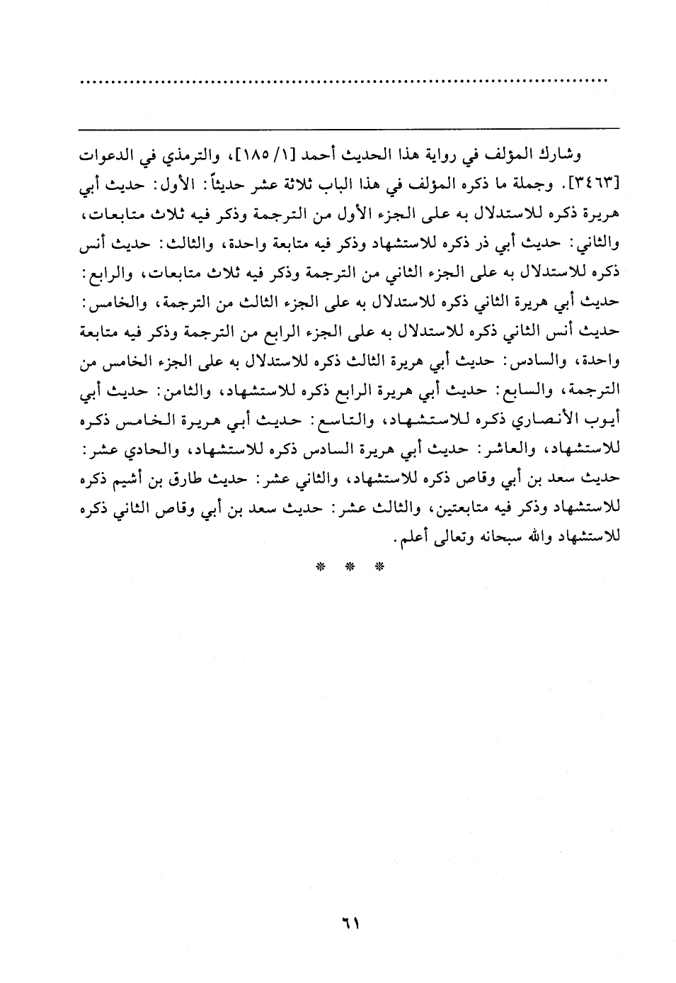 وشارك المؤلف في رواية هذا الحديث أحمد [١/ ١٨٥]، والترمذي في الدعوات [٣٤٦٣]. وجملة ما ذكره المؤلف في هذا الباب ثلاثة عشر حديثًا: الأول: حديث أبي هريرة ذكره للاستدلال به على الجزء الأول من الترجمة وذكر فيه ثلاث متابعات، والثاني: حديث أبي ذر ذكره للاستشهاد وذكر فيه متابعة واحدة، والثالث: حديث أنس ذكره للاستدلال به على الجزء الثاني من الترجمة وذكر فيه ثلاث متابعات، والرابع: حديث أبي هريرة الثاني ذكره للاستدلال به على الجزء الثالث من الترجمة، والخامس: حديث أنس الثاني ذكره للاستدلال به على الجزء الرابع من الترجمة وذكر فيه متابعة واحدة، والسادس: حديث أبي هريرة الثالث ذكره للاستدلال به على الجزء الخامس من الترجمة، والسابع: حديث أبي هريرة الرابع ذكره للاستشهاد، والثامن: حديث أبي أيوب الأنصاري ذكره للاستشهاد، والتاسع: حديث أبي هريرة الخامس ذكره للاستشهاد، والعاشر: حديث أبي هريرة السادس ذكره للاستشهاد، والحادي عشر: حديث سعد بن أبي وقاص ذكره للاستشهاد، والثاني عشر: حديث طارق بن أشيم ذكره للاستشهاد وذكر فيه متابعتين، والثالث عشر: حديث سعد بن أبي وقاص الثاني ذكره للاستشهاد والله سبحانه وتعالى أعلم.