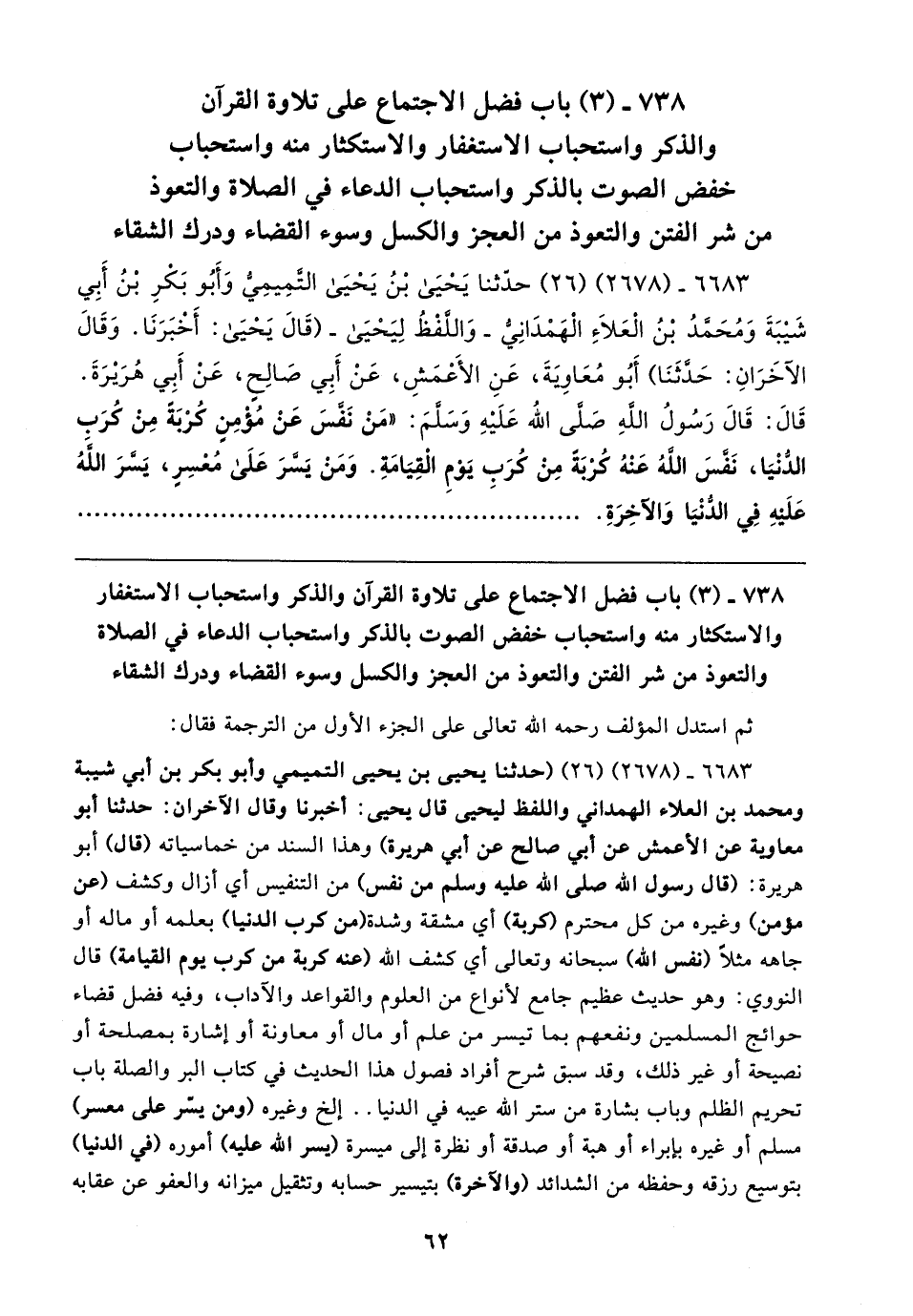 ٧٣٨ - (٣) باب فضل الاجتماع على تلاوة القرآن والذكر واستحباب الاستغفار والاستكثار منه واستحباب خفض الصوت بالذكر واستحباب الدعاء في الصلاة والتعوذ من شر الفتن والتعوذ من العجز والكسل وسوء القضاء ودرك الشقاء