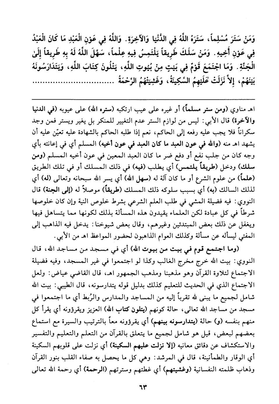 وَمَنْ سَتَرَ مُسْلِمًا، سَتَرَهُ اللهُ فِي الدُّنْيَا وَالآخِرَةِ. وَاللهُ فِي عَوْنِ الْعَبْدِ مَا كَانَ الْعَبْدُ فِي عَوْنِ أَخِيهِ. وَمَنْ سَلَكَ طَرِيقًا يَلْتَمِسُ فِيهِ عِلْمًا، سَهَّلَ اللهُ لَهُ بِهِ طَرِيقًا إِلَى الْجَنَّةِ. وَمَا اجْتَمَعَ قَوْمٌ فِي بَيتٍ مِنْ بُيُوتِ اللهِ، يَتْلُونَ كِتَابَ اللهِ، وَيَتَدَارَسُونَهُ بَينَهُمْ، إِلَّا نَزَلَتْ عَلَيهِمُ السَّكِينَةُ، وَغَشِيَتْهُمُ الرَّحْمَةُ