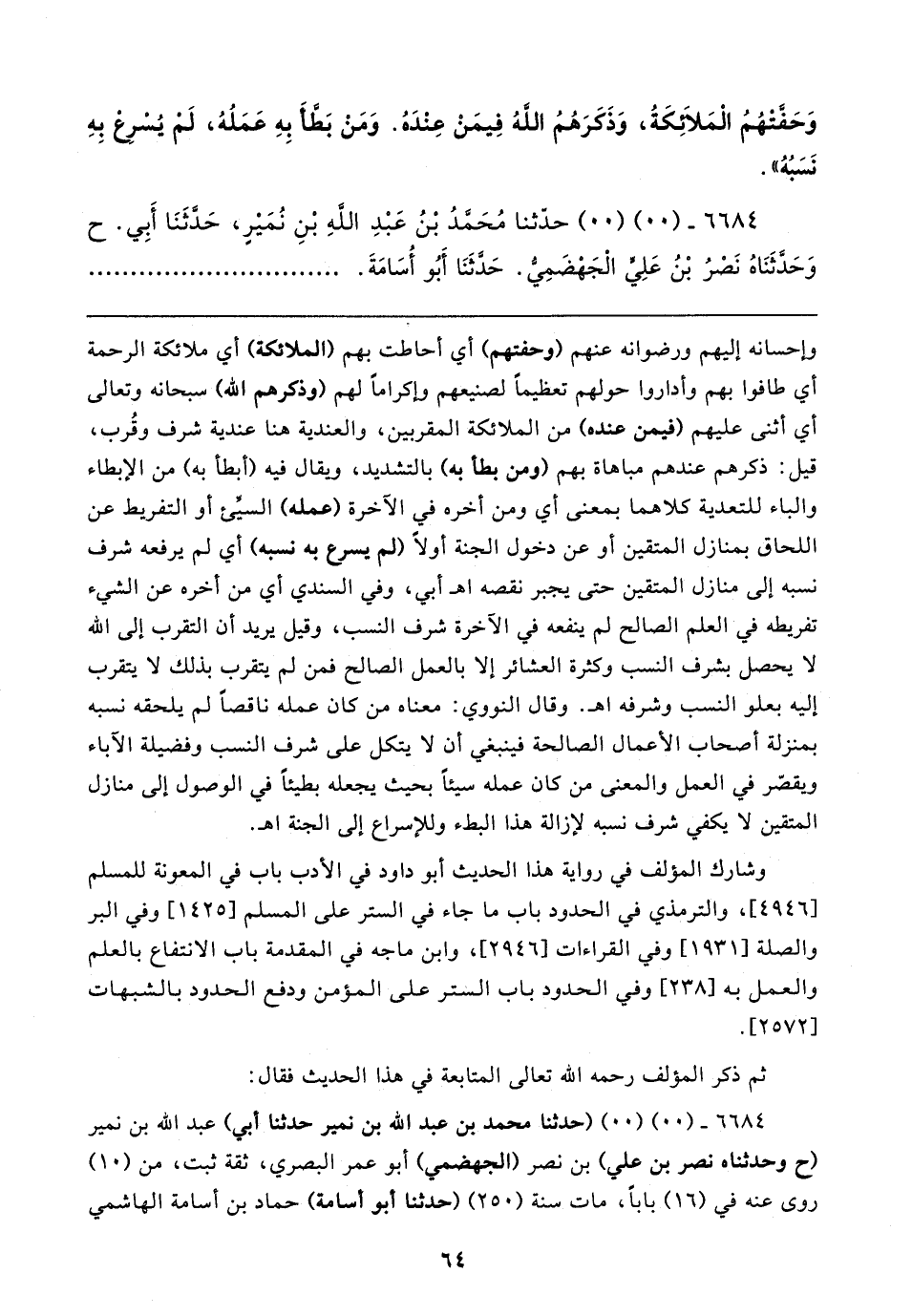وإحسانه إليهم ورضوانه عنهم (وحفتهم) أي أحاطت بهم (الملائكة) أي ملائكة الرحمة أي طافوا بهم وأداروا حولهم تعظيمًا لصنيعهم وإكرامًا لهم (وذكرهم الله) سبحانه وتعالى أي أثنى عليهم (فيمن عنده) من الملائكة المقربين، والعندية هنا عندية شرف وقُرب، قيل: ذكرهم عندهم مباهاة بهم (ومن بطأ به) بالتشديد، ويقال فيه (أبطأ به) من الإبطاء والباء للتعدية كلاهما بمعنى أي ومن أخره في الآخرة (عمله) السيِّئ أو التفريط عن اللحاق بمنازل المتقين أو عن دخول الجنة أولًا (لم يسرع به نسبه) أي لم يرفعه شرف نسبه إلى منازل المتقين حتى يجبر نقصه اه أبي، وفي السندي أي من أخره عن الشيء تفريطه في العلم الصالح لم ينفعه في الآخرة شرف النسب، وقيل يريد أن التقرب إلى الله لا يحصل بشرف النسب وكثرة العشائر إلا بالعمل الصالح فمن لم يتقرب بذلك لا يتقرب إليه بعلو النسب وشرفه اه. وقال النووي: معناه من كان عمله ناقصًا لم يلحقه نسبه بمنزلة أصحاب الأعمال الصالحة فينبغي أن لا يتكل على شرف النسب وفضيلة الآباء ويقصّر في العمل والمعنى من كان عمله سيئًا بحيث يجعله بطيئًا في الوصول إلى منازل المتقين لا يكفي شرف نسبه لإزالة هذا البطء وللإسراع إلى الجنة اه.