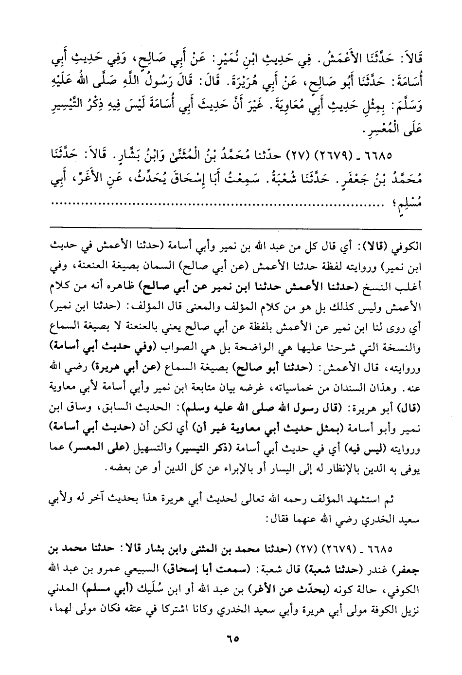 الكوفي (قالا): أي قال كل من عبد الله بن نمير وأبي أسامة (حدثنا الأعمش في حديث ابن نمير) وروايته لفظة حدثنا الأعمش (عن أبي صالح) السمان بصيغة العنعنة، وفي أغلب النسخ (حدثنا الأعمش حدثنا ابن نمير عن أبي صالح) ظاهره أنه من كلام الأعمش وليس كذلك بل هو من كلام المؤلف والمعنى قال المؤلف: (حدثنا ابن نمير) أي روى لنا ابن نمير عن الأعمش بلفظة عن أبي صالح يعني بالعنعنة لا بصيغة السماع والنسخة التي شرحنا عليها هي الواضحة بل هي الصواب (وفي حديث أبي أسامة) وروايته، قال الأعمش: (حدثنا أبو صالح) بصيغة السماع (عن أبي هريرة) رضي الله عنه. وهذان السندان من خماسياته، غرضه بيان متابعة ابن نمير وأبي أسامة لأبي معاوية (قال) أبو هريرة: (قال رسول الله صلى الله عليه وسلم): الحديث السابق، وساق ابن نمير وأبو أسامة (بمثل حديث أبي معاوية غير أن) أي لكن أن (حديث أبي أسامة) وروايته (ليس فيه) أي في حديث أبي أسامة (ذكر التيسير) والتسهيل (على المعسر) عما يوفى به الدين بالإنظار له إلى اليسار أو بالإبراء عن كل الدين أو عن بعضه.