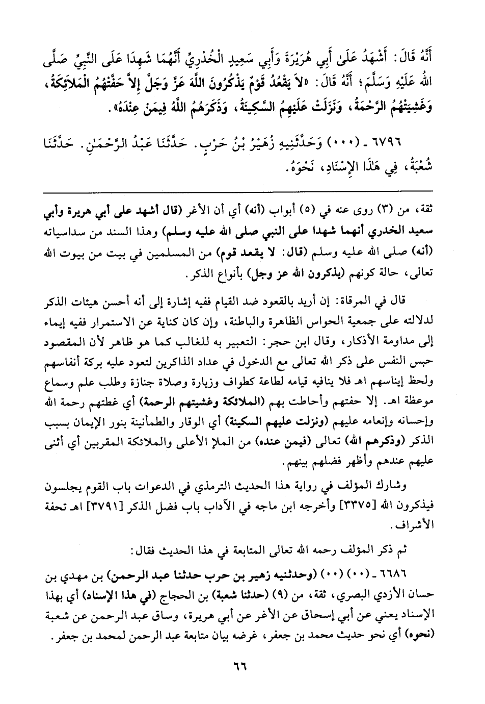 ثقة، من (٣) روى عنه في (٥) أبواب (أنه) أي أن الأغر (قال أشهد على أبي هريرة وأبي سعيد الخدري أنهما شهدا على النبي صلى الله عليه وسلم) وهذا السند من سداسياته (أنه) صلى الله عليه وسلم (قال: لا يقعد قوم) من المسلمين في بيت من بيوت الله تعالى، حالة كونهم (يذكرون الله عز وجل) بأنواع الذكر.