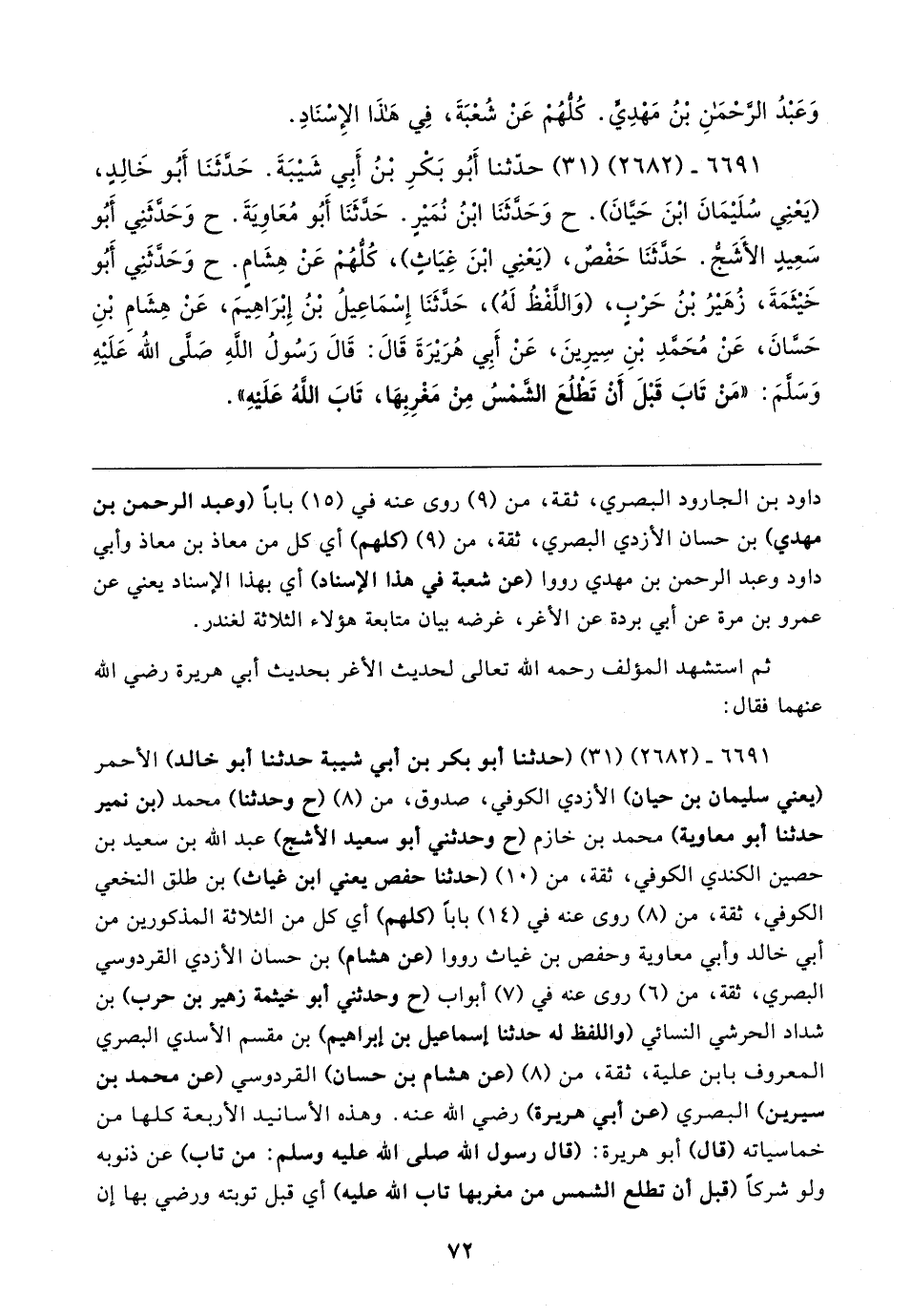 ٦٦٩١ - (٢٦٨٢) (٣١) (حدثنا أبو بكر بن أبي شيبة حدثنا أبو خالد) الأحمر (يعني سليمان بن حيان) الأزدي الكوفي، صدوق، من (٨) (ح وحدثنا) محمد (بن نمير حدثنا أبو معاوية) محمد بت خازم (ح وحدثني أبو سعيد الأشج) عبد الله بن سعيد بن حصين الكندي الكوفي، ثقة، من (١٥) (حدثنا حفص يعني ابن غياث) بن طلق النخعي الكوفي، ثقة، من (٨) روى عنه في (١٤) بابًا (كلهم) أي كل من الثلاثة المذكورين من أبي خالد وأبي معاوية وحفص بن غياث رووا (عن هشام) بن حسان الأزدي القردوسي البصري، ثقة، من (٦) روى عنه في (٧) أبواب (ح وحدثني أبو خيثمة زهير بن حرب) بن شداد الحرشي النسائي (واللفظ له حدثنا إسماعيل بن إبراهيم) بن مقسم الأسدي البصري المعروف بابن علية، ثقة، من (٨) (عن هشام بن حسان) القردوسي (عن محمد بن سيرين) البصري (عن أبي هريرة) رضي الله عنه. وهذه الأسانيد الأربعة كلها من خماسياته (قال) أبو هريرة: (قال رسول الله صلى الله عليه وسلم: من تاب) عن ذنوبه ولو شركًا (قبل أن تطلع الشمس من مغربها تاب الله عليه) أي قبل توبته ورضي بها إن