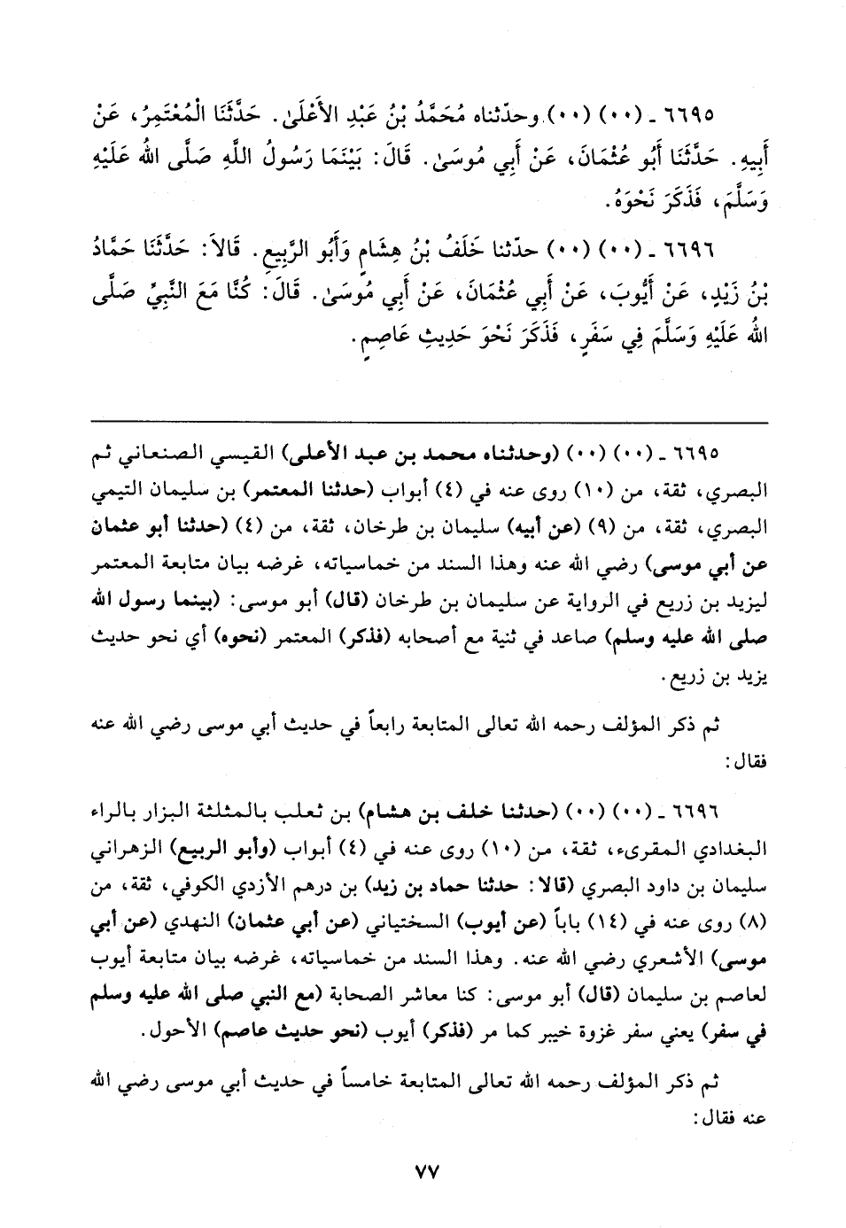 ٦٦٩٦ - (٠٠) (٠٠) (حدثنا خلف بن هشام) بن ثعلب بالمثلثة البزار بالراء البغدادي المقرئ، ثقة، من (١٠) روى عنه في (٤) أبواب (وأبو الربيع) الزهراني سليمان بن داود البصري (قالا: حدثنا حماد بن زيد) بن درهم الأزدي الكوفي، ثقة، من (٨) روى عنه في (١٤) بابًا (عن أيوب) السختياني (عن أبي عثمان) النهدي (عن أبي موسى) الأشعري رضي الله عنه. وهذا السند من خماسياته، غرضه بيان متابعة أيوب لعاصم بن سليمان (قال) أبو موسى: كنا معاشر الصحابة (مع النبي صلى الله عليه وسلم في سفر) يعني سفر غزوة خيبر كما مر (فذكر) أيوب (نحو حديث عاصم) الأحول.