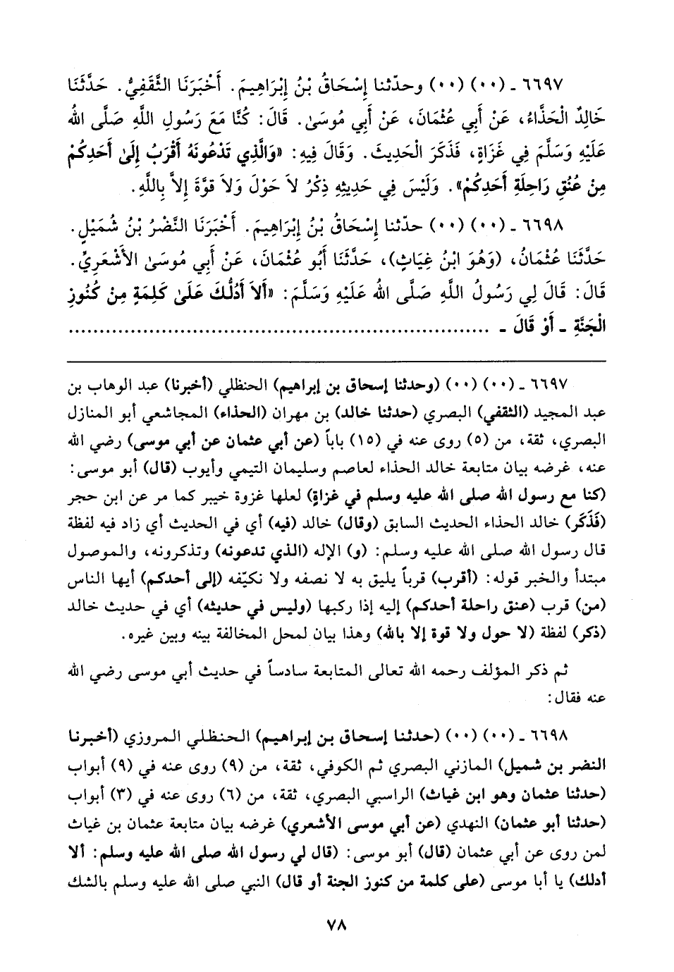 ٦٦٩٨ - (٠٠) (٠٠) (حدثنا إسحاق بن إبراهيم) الحنظلي المروزي (أخبرنا النضر بن شميل) المازني البصري ثم الكوفي، ثقة، من (٩) روى عنه في (٩) أبواب (حدثنا عثمان وهو ابن غياث) الراسبي البصري، ثقة، من (٦) روى عنه في (٣) أبواب (حدثنا أبو عثمان) النهدي (عن أبي موسى الأشعري) غرضه بيان متابعة عثمان بن غياث لمن روى عن أبي عثمان (قال) أبو موسى: (قال لي رسول الله صلى الله عليه وسلم: ألا أدلك) يا أبا موسى (على كلمة من كنوز الجنة أو قال) النبي صلى الله عليه وسلم بالشك