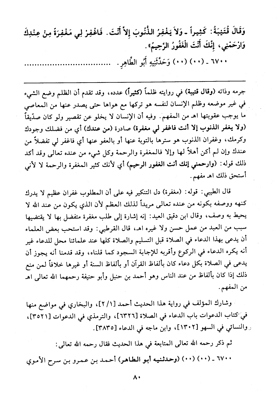 -وَقَالَ قُتَيبَةُ: كَثِيرًا- وَلَا يَغفِرُ الذُّنُوبَ إِلَّا أَنْتَ. فَاغْفِرْ لِي مَغفِرَةً مِنْ عِنْدِكَ وَارْحَمْنِي، إِنَّكَ أَنْتَ الْغَفُورُ الرَّحِيمُ".