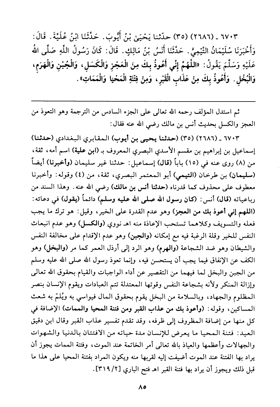 ٦٧٠٣ - (٢٦٨٦) (٣٥) حدّثنا يَحْيَى بْنُ أَيُّوبَ. حَدَّثَنَا ابْنُ عُلَيَّةَ. قَالَ: وَأَخْبَرَنَا سُلَيْمَانُ التَّيْمِيُّ. حَدَّثَنَا أَنسُ بْنُ مَالِكٍ. قَالَ: كَانَ رَسُولُ اللهِ صَلَّى اللهُ عَلَيْهِ وَسَلَّمَ يَقُولُ: "اللَّهُمَّ إِنِّي أَعُوذُ بِكَ مِنَ الْعَجْزِ وَالْكَسَلِ، وَالْجُبْنِ وَالْهَرَمِ، وَالْبُخْلِ. وَأَعُوذُ بِكَ مِنْ عَذَابِ الْقَبْرِ، وَمِنْ فِتْنَةِ الْمَحْيَا وَالْمَمَاتِ "