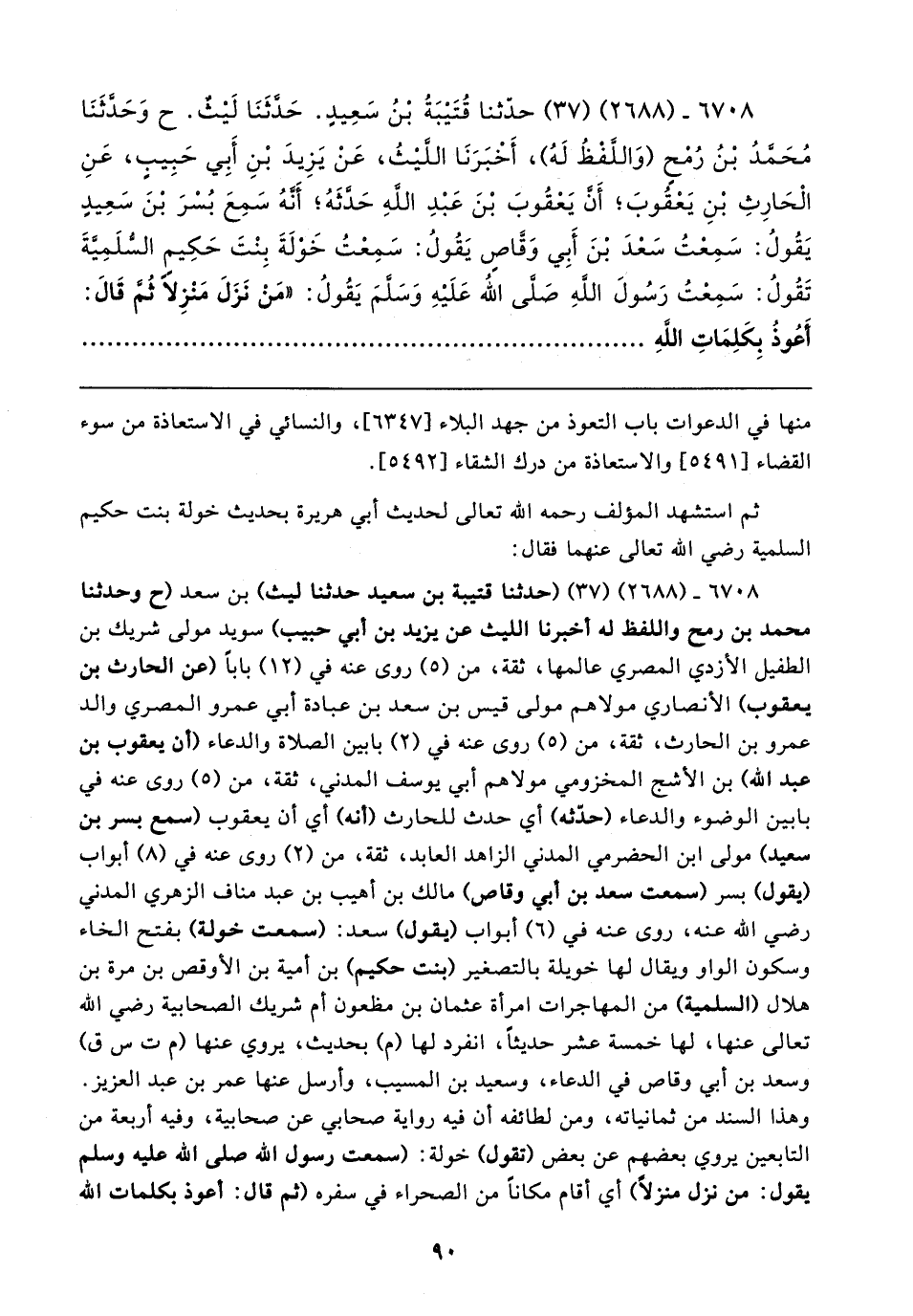 ٦٧٠٨ - (٢٦٨٨) (٣٧) (حدثنا قتيبة بن سعيد حدثنا ليث) بن سعد (ح وحدثنا محمد بن رمح واللفظ له أخبرنا الليث عن يزيد بن أبي حبيب) سويد مولى شريك بن الطفيل الأزدي المصري عالمها، ثقة، من (٥) روى عنه في (١٢) بابًا (عن الحارث بن يعقوب) الأنصاري مولاهم مولى قيس بن سعد بن عبادة أبي عمرو المصري والد عمرو بن الحارث، ثقة، من (٥) روى عنه في (٢) بابين الصلاة والدعاء (أن يعقوب بن عبد الله) بن الأشج المخزومي مولاهم اْبي يوسف المدني، ثقة، من (٥) روى عنه في بابين الوضوء والدعاء (حدّثه) أي حدث للحارث (أنه) أي أن يعقوب (سمع بسر بن سعيد) مولى ابن الحضرمي المدني الزاهد العابد، ثقة، من (٢) روى عنه في (٨) أبواب (يقول) بسر (سمعت سعد بن أبي وقاص) مالك بن أهيب بن عبد مناف الزهري المدني رضي الله عنه، روى عنه في (٦) أبواب (يقول) سعد: (سمعت خولة) بفتح الخاء وسكون الواو ويقال لها خويلة بالتصغير (بنت حكيم) بن أمية بن الأوقص بن مرة بن هلال (السلمية) من المهاجرات امرأة عثمان بن مظعون أم شريك الصحابية رضي الله تعالى عنها، لها خمسة عشر حديثًا، انفرد لها (م) بحديث، يروي عنها (م ت س ق) وسعد بن أبي وقاص في الدعاء، وسعيد بن المسيب، وأرسل عنها عمر بن عبد العزيز. وهذا السند من ثمانياته، ومن لطائفه أن فيه رواية صحابي عن صحابية، وفيه أربعة من التابعين يروي بعضهم عن بعض (تقول) خولة: (سمعت رسول الله صلى الله عليه وسلم يقول: من نزل منزلًا) أي أقام مكانًا من الصحراء في سفره (ثم قال: أعوذ بكلمات الله