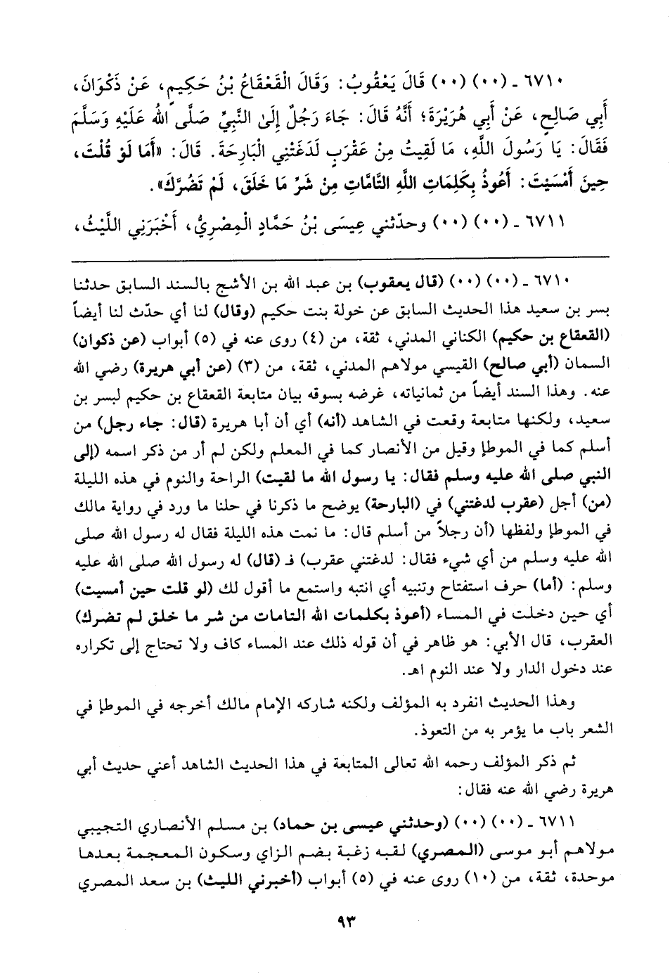 ٦٧١٠ - (٠٠) (٠٠) (قال يعقوب) بن عبد الله بن الأشج بالسند السابق حدثنا بسر بن سعيد هذا الحديث السابق عن خولة بنت حكيم (وقال) لنا أي حدّث لنا أيضًا (القعقاع بن حكيم) الكناني المدني، ثقة، من (٤) روى عنه في (٥) أبواب (عن ذكوان) السمان (أبي صالح) القيسي مولاهم المدني، ثقة، من (٣) (عن أبي هريرة) رضي الله عنه. وهذا السند أيضًا من ثمانياته، غرضه بسوقه بيان متابعة القعقاع بن حكيم لبسر بن سعيد، ولكنها متابعة وقعت في الشاهد (أنه) أي أن أبا هريرة (قال: جاء رجل) من أسلم كما في الموطإ وقيل من الأنصار كما في المعلم ولكن لم أر من ذكر اسمه (إلى النبي صلى الله عليه وسلم فقال: يا رسول الله ما لقيت) الراحة والنوم في هذه الليلة (من) أجل (عقرب لدغتني) في (البارحة) يوضح ما ذكرنا في حلنا ما ورد في رواية مالك في الموطإ ولفظها (أن رجلًا من أسلم قال: ما نمت هذه الليلة فقال له رسول الله صلى الله عليه وسلم من أي شيء فقال: لدغتني عقرب) فـ (قال) له رسول الله صلى الله عليه وسلم: (أما) حرف استفتاح وتنبيه أي انتبه واستمع ما أقول لك (لو قلت حين أمسيت) أي حين دخلت في المساء (أعوذ بكلمات الله التامات من شر ما خلق لم تضرك) العقرب، قال الأبي: هو ظاهر في أن قوله ذلك عند المساء كاف ولا تحتاج إلى تكراره عند دخول الدار ولا عند النوم اه.