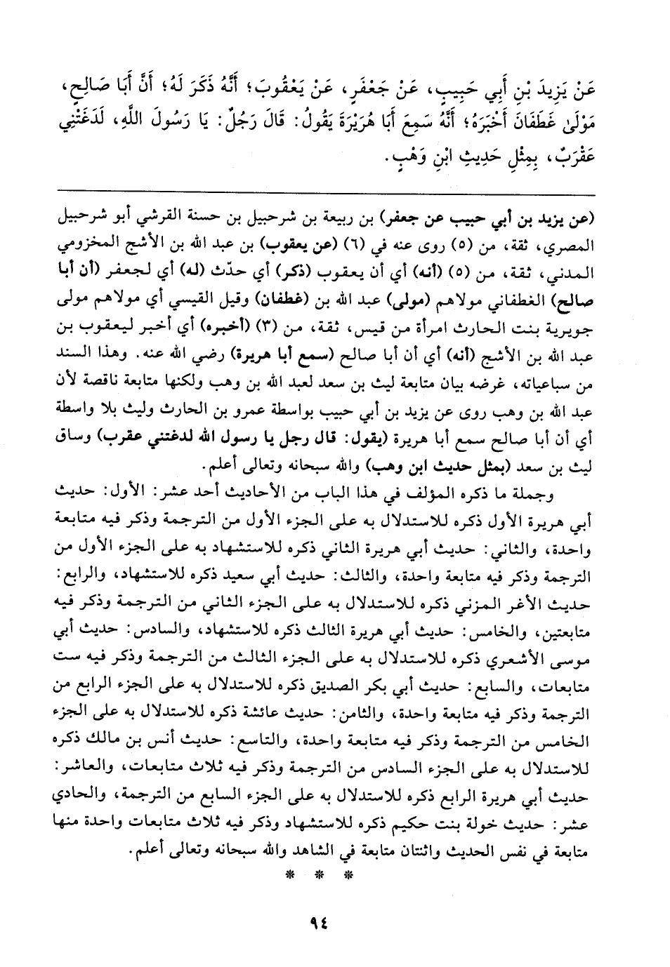 (عن يزيد بن أبي حبيب عن جعفر) بن ربيعة بن شرحبيل بن حسنة القرشي أبو شرحبيل المصري، ثقة، من (٥) روى عنه في (٦) (عن يعقوب) بن عبد الله بن الأشج المخزومي المدني، ثقة، من (٥) (أنه) أي أن يعقوب (ذكر) أي حدّث (له) أي لجعفر (أن أبا صالح) الغطفاني مولاهم (مولى) عبد الله بن (غطفان) وقيل القيسي أي مولاهم مولى جويرية بنت الحارث امرأة من قيس، ثقة، من (٣) (أخبره) أي أخبر ليعقوب بن عبد الله بن الأشج (أنه) أي أن أبا صالح (سمع أبا هريرة) رضي الله عنه. وهذا السند من سباعياته، غرضه بيان متابعة ليث بن سعد لعبد الله بن وهب ولكنها متابعة ناقصة لأن عبد الله بن وهب روى عن يزيد بن أبي حبيب بواسطة عمرو بن الحارث وليث بلا واسطة أي أن أبا صالح سمع أبا هريرة (يقول: قال رجل يا رسول الله لدغتني عقرب) وساق ليث بن سعد (بمثل حديث ابن وهب) والله سبحانه وتعالى أعلم.