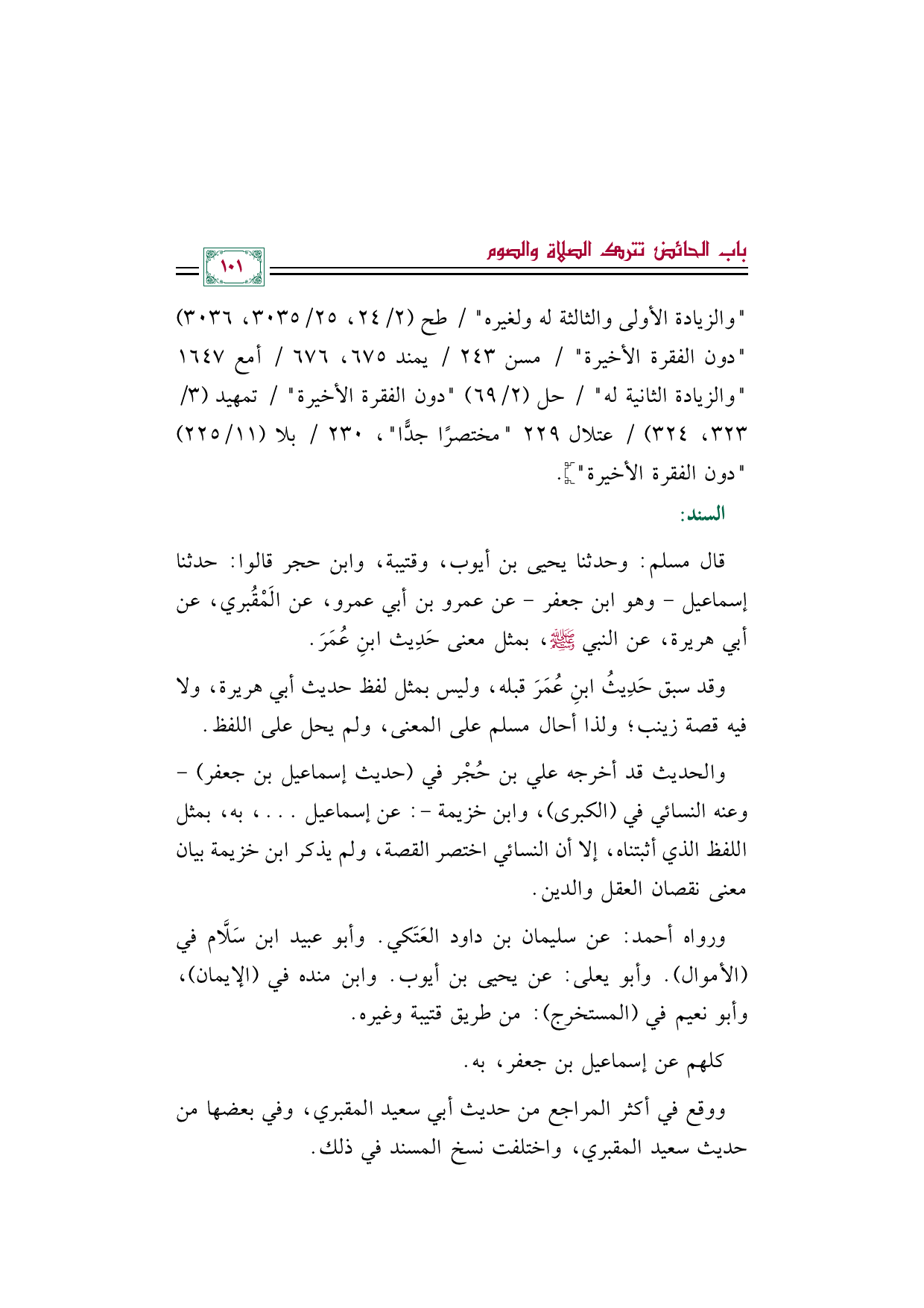 والزيادة الأولى والثالثة له ولغيره/ طح (٢/ ٢٤، ٢٥/ ٣٠٣٥، ٣٠٣٦) دون الفقرة الأخيرة/ مسن ٢٤٣/ يمند ٦٧٥، ٦٧٦/ أمع ١٦٤٧ والزيادة الثانية له/ حل (٢/ ٦٩) دون الفقرة الأخيرة/ تمهيد (٣/ ٣٢٣، ٣٢٤) / عتلال ٢٢٩ مختصرًا جدًّا، ٢٣٠/ بلا (١١/ ٢٢٥) دون الفقرة الأخيرة].