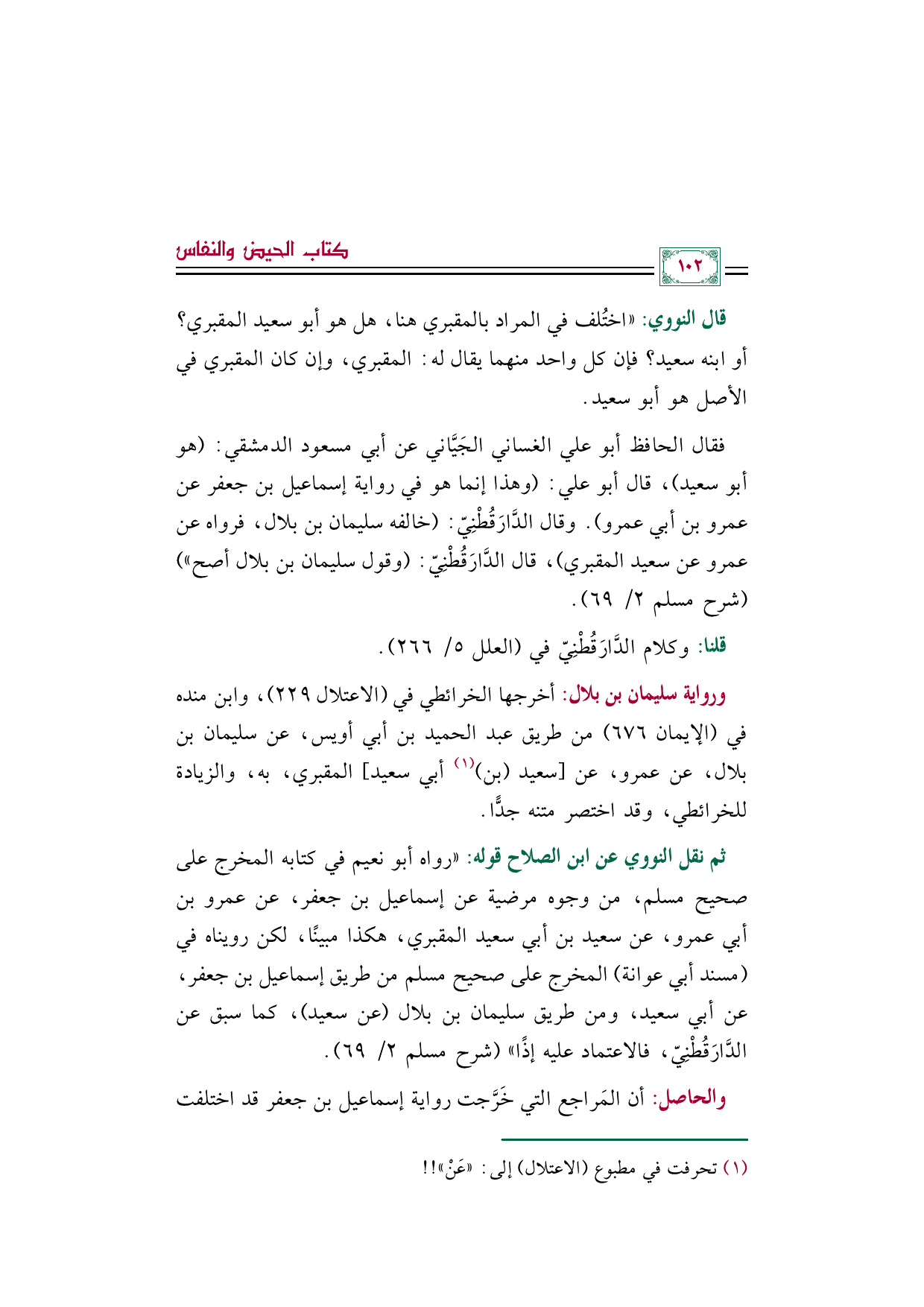 ثم نقل النووي عن ابن الصلاح قوله: ((رواه أبو نعيم في كتابه المخرج على صحيح مسلم، من وجوه مرضية عن إسماعيل بن جعفر، عن عمرو بن أبي عمرو، عن سعيد بن أبي سعيد المقبري، هكذا مبينًا، لكن رويناه في (مسند أبي عوانة) المخرج على صحيح مسلم من طريق إسماعيل بن جعفر، عن أبي سعيد، ومن طريق سليمان بن بلال (عن سعيد)، كما سبق عن الدَّارَقُطْنِيّ، فالاعتماد عليه إذًا)) (شرح مسلم ٢/ ٦٩).