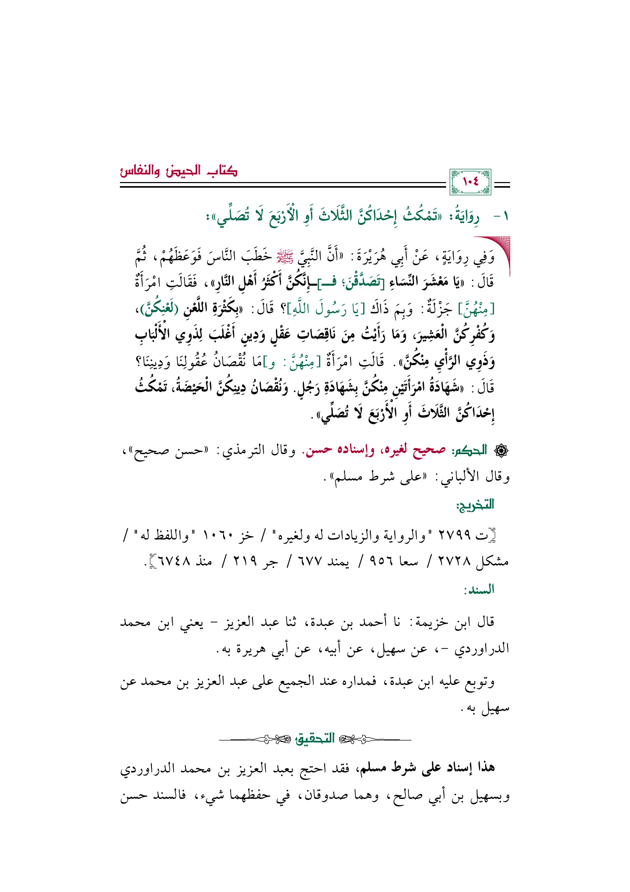 • وَفِي رِوَايَةٍ، عَنْ أَبِي هُرَيْرَةَ: ((أَنَّ النَّبِيَّ صَلَّى اللهُ عَلَيْهِ وَسَلَّمَ خَطَبَ النَّاسَ فَوَعَظَهُمْ، ثُمَّ قَالَ: ((يَا مَعْشَرَ النِّسَاءِ [تَصَدَّقْنَ؛ فـ]ـإِنَّكُنَّ أَكْثَرُ أَهْلِ النَّارِ))، فَقَالَتِ امْرَأَةٌ [مِنْهُنَّ] جَزْلَةٌ: وَبِمَ ذَاكَ [يَا رَسُولَ اللَّهِ]؟ قَالَ: ((بِكَثْرَةِ اللَّعْنِ (لَعْنِكُنَّ)، وَكُفْرِكُنَّ الْعَشِيرَ، وَمَا رَأَيْتُ مِنَ نَاقِصَاتِ عَقْلٍ وَدِينٍ أَغْلَبَ لِذَوِي الْأَلْبَابِ وَذَوِي الرَّأْيِ مِنْكُنَّ)). قَالَتِ امْرَأَةٌ [مِنْهُنَّ: و] مَا نُقْصَانُ عُقُولِنَا وَدِينِنَا؟ قَالَ: ((شَهَادَةُ امْرَأَتَيْنِ مِنْكُنَّ بِشَهَادَةِ رَجُلٍ. وَنُقْصَانُ دِينِكُنَّ الْحَيْضَةُ، تَمْكُثُ إِحْدَاكُنَّ الثَّلَاثَ أَوِ الْأَرْبَعَ لَا تُصَلِّي)).
