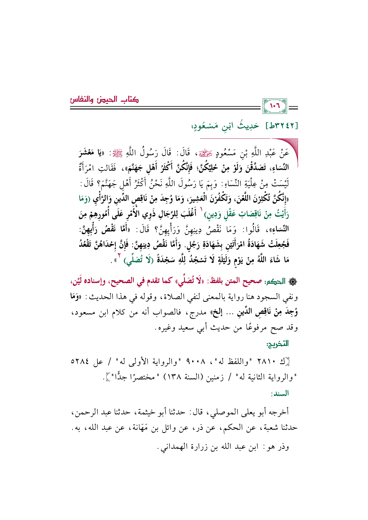 [الحكم]: صحيح المتن بلفظ: ((لَا تُصَلِّي)) كما تقدم في الصحيح، وإسناده لَيِّن، ونفي السجود هنا رواية بالمعنى لنفي الصلاة، وقوله في هذا الحديث: ((وَمَا وُجِدَ مِنْ نَاقِصِ الدِّينِ ... إلخ)) مدرج، فالصواب أنه من كلام ابن مسعود، وقد صح مرفوعًا من حديث أبي سعيد وغيره.