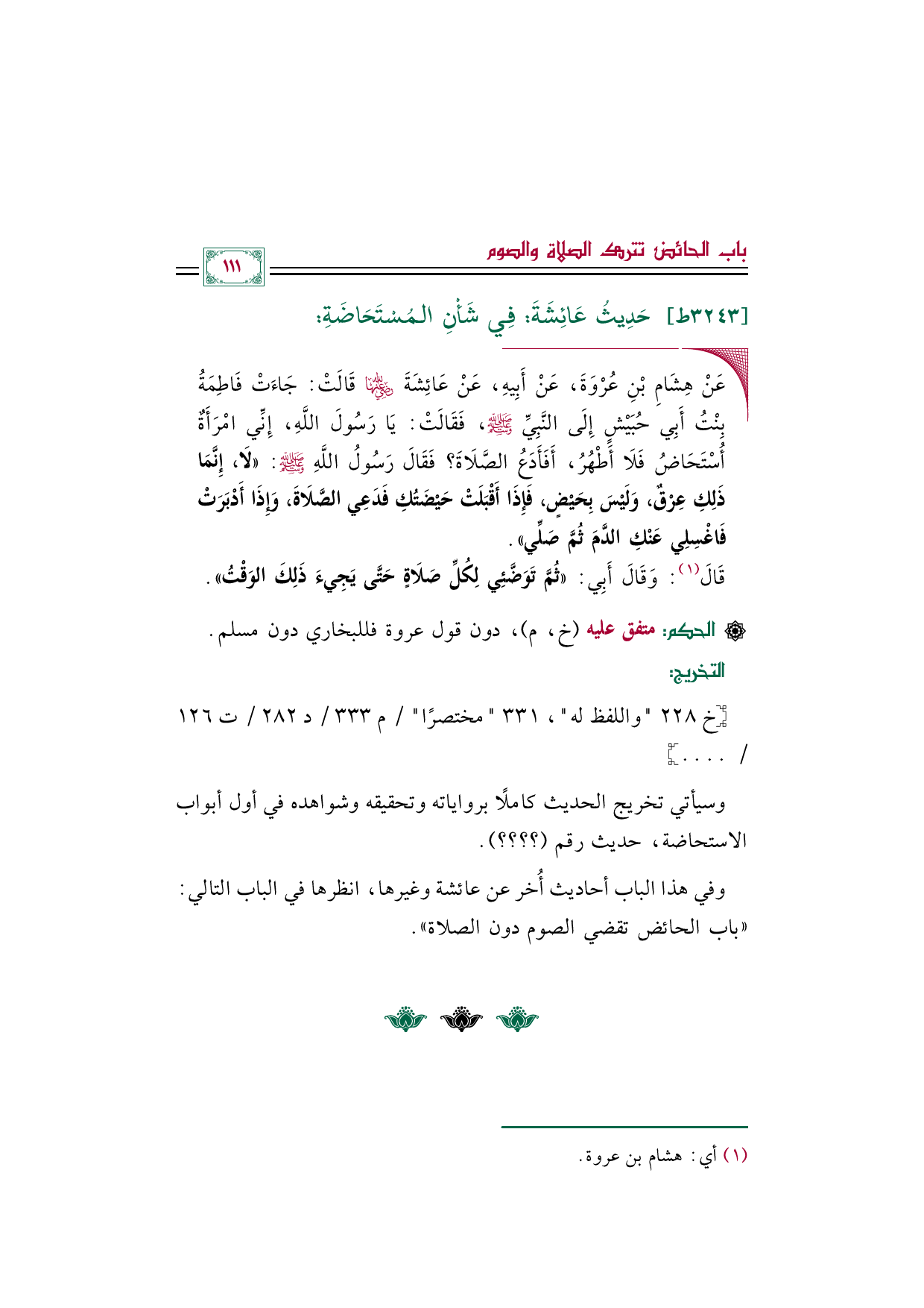 وسيأتي تخريج الحديث كاملًا برواياته وتحقيقه وشواهده في أول أبواب الاستحاضة، حديث رقم (؟ ؟ ؟ ؟ ).