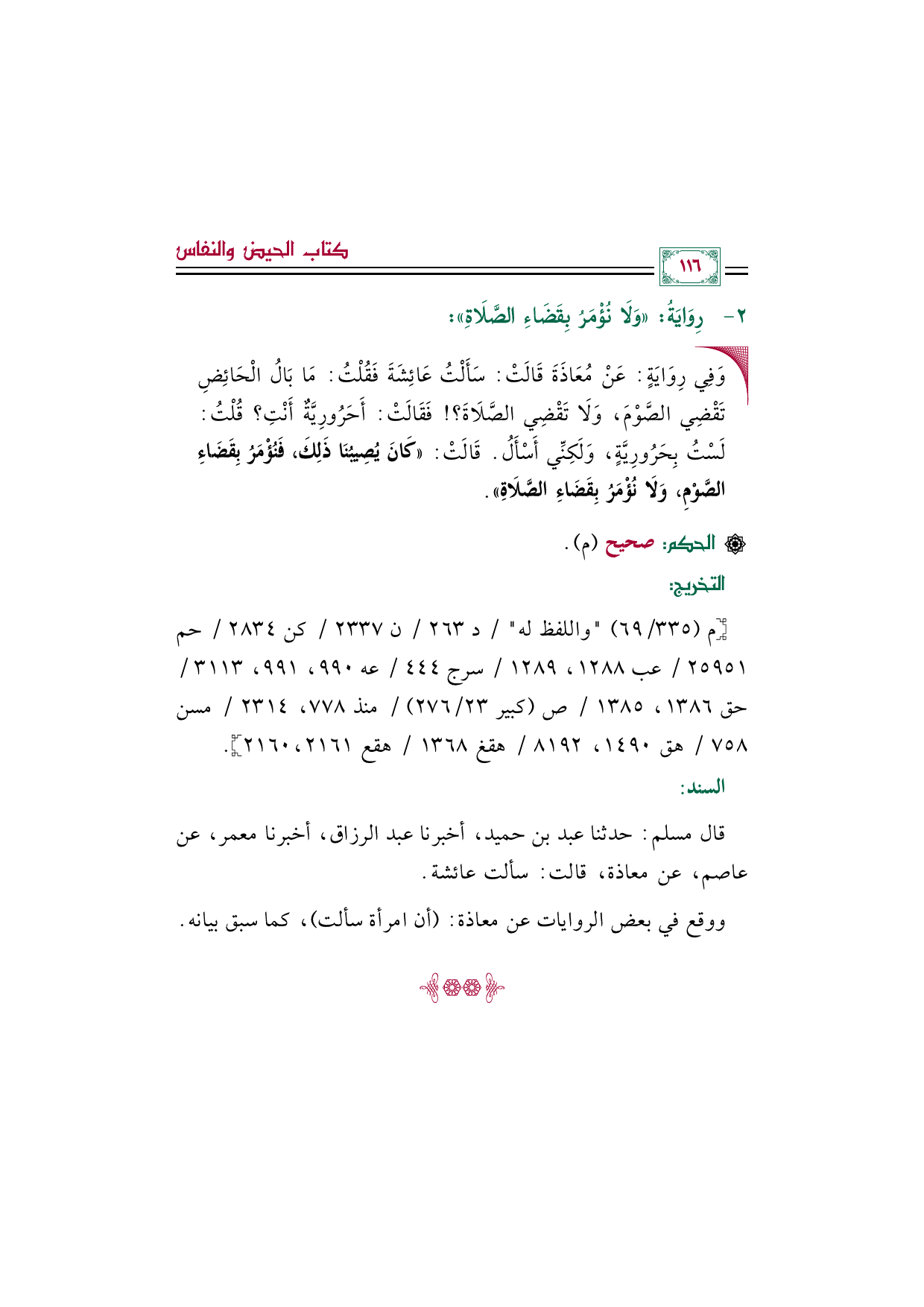 • وَفِي رِوَايَةٍ: عَنْ مُعَاذَةَ قَالَتْ: سَأَلْتُ عَائِشَةَ فَقُلْتُ: مَا بَالُ الْحَائِضِ تَقْضِي الصَّوْمَ، وَلَا تَقْضِي الصَّلَاةَ؟! فَقَالَتْ: أَحَرُورِيَّةٌ أَنْتِ؟ قُلْتُ: لَسْتُ بِحَرُورِيَّةٍ، وَلَكِنِّي أَسْأَلُ. قَالَتْ: ((كَانَ يُصِيبُنَا ذَلِكَ، فَنُؤْمَرُ بِقَضَاءِ الصَّوْمِ، وَلَا نُؤْمَرُ بِقَضَاءِ الصَّلَاةِ)).