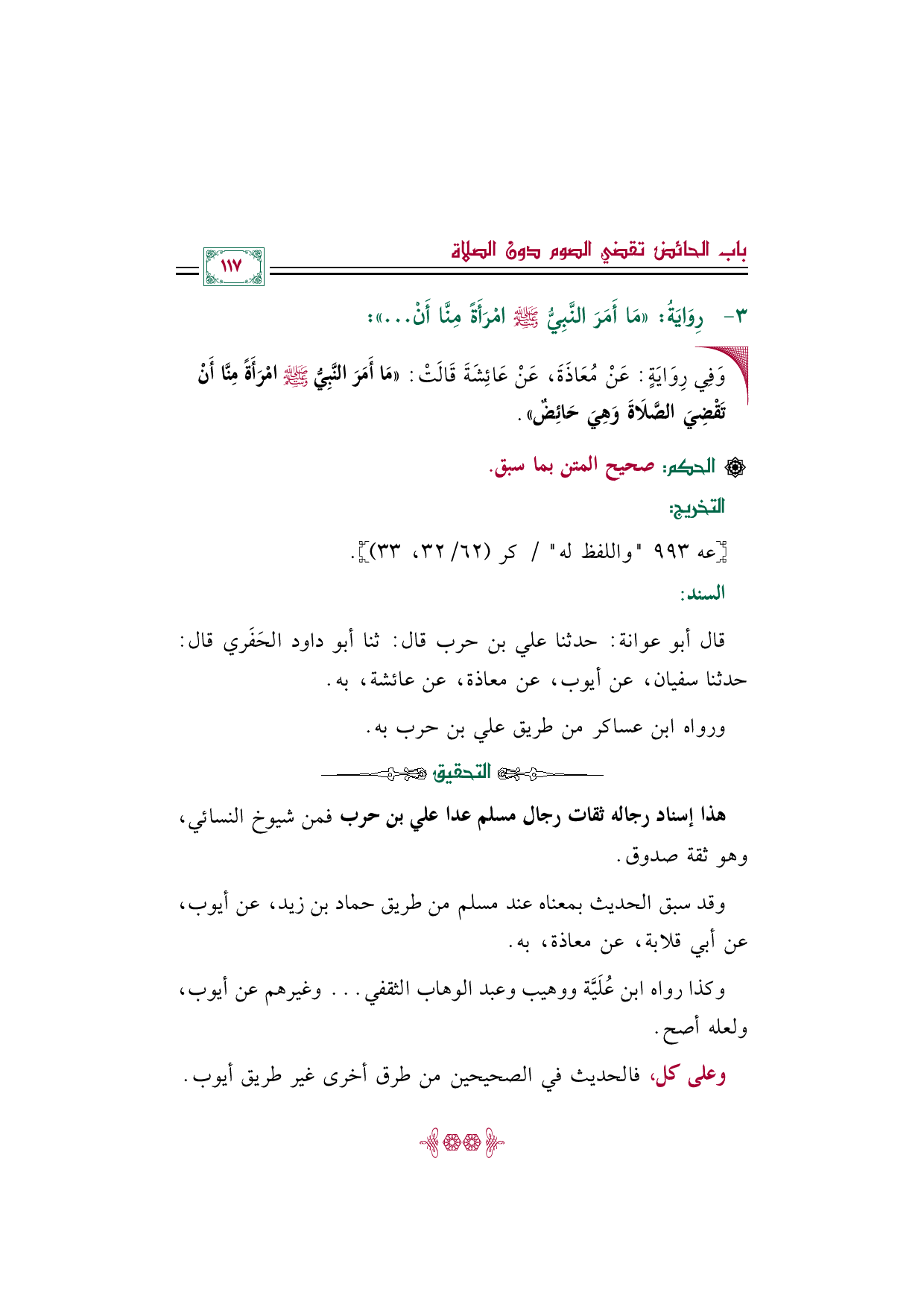 قال أبو عوانة: حدثنا علي بن حرب قال: ثنا أبو داود الحَفَري قال: حدثنا سفيان، عن أيوب، عن معاذة، عن عائشة، به.