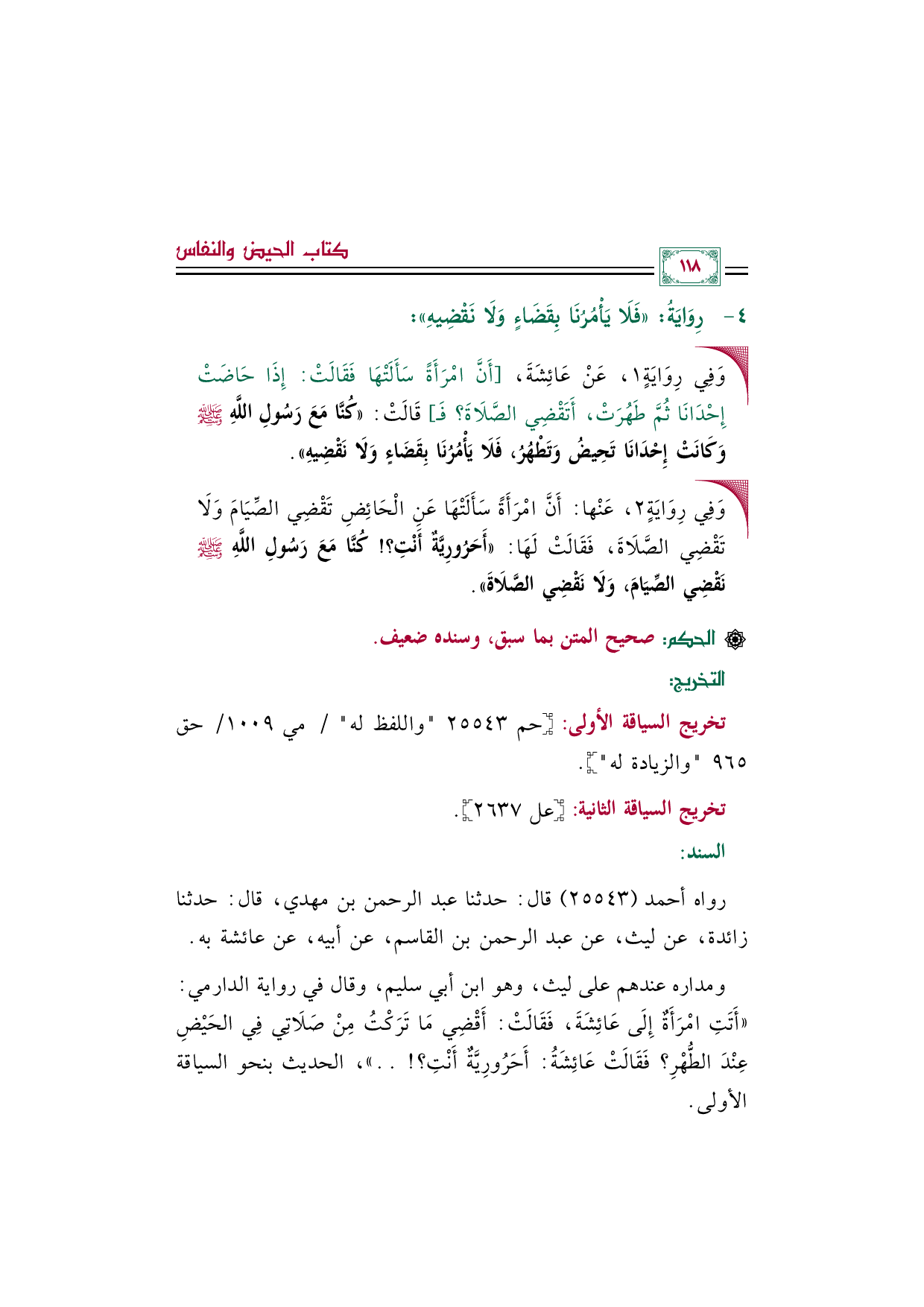 ومداره عندهم على ليث، وهو ابن أبي سليم، وقال في رواية الدارمي: ((أَتَتِ امْرَأَةٌ إِلَى عَائِشَةَ، فَقَالَتْ: أَقْضِي مَا تَرَكْتُ مِنْ صَلَاتِي فِي الحَيْضِ عِنْدَ الطُّهْرِ؟ فَقَالَتْ عَائِشَةُ: أَحَرُورِيَّةٌ أَنْتِ؟! .. ))، الحديث بنحو السياقة الأولى.